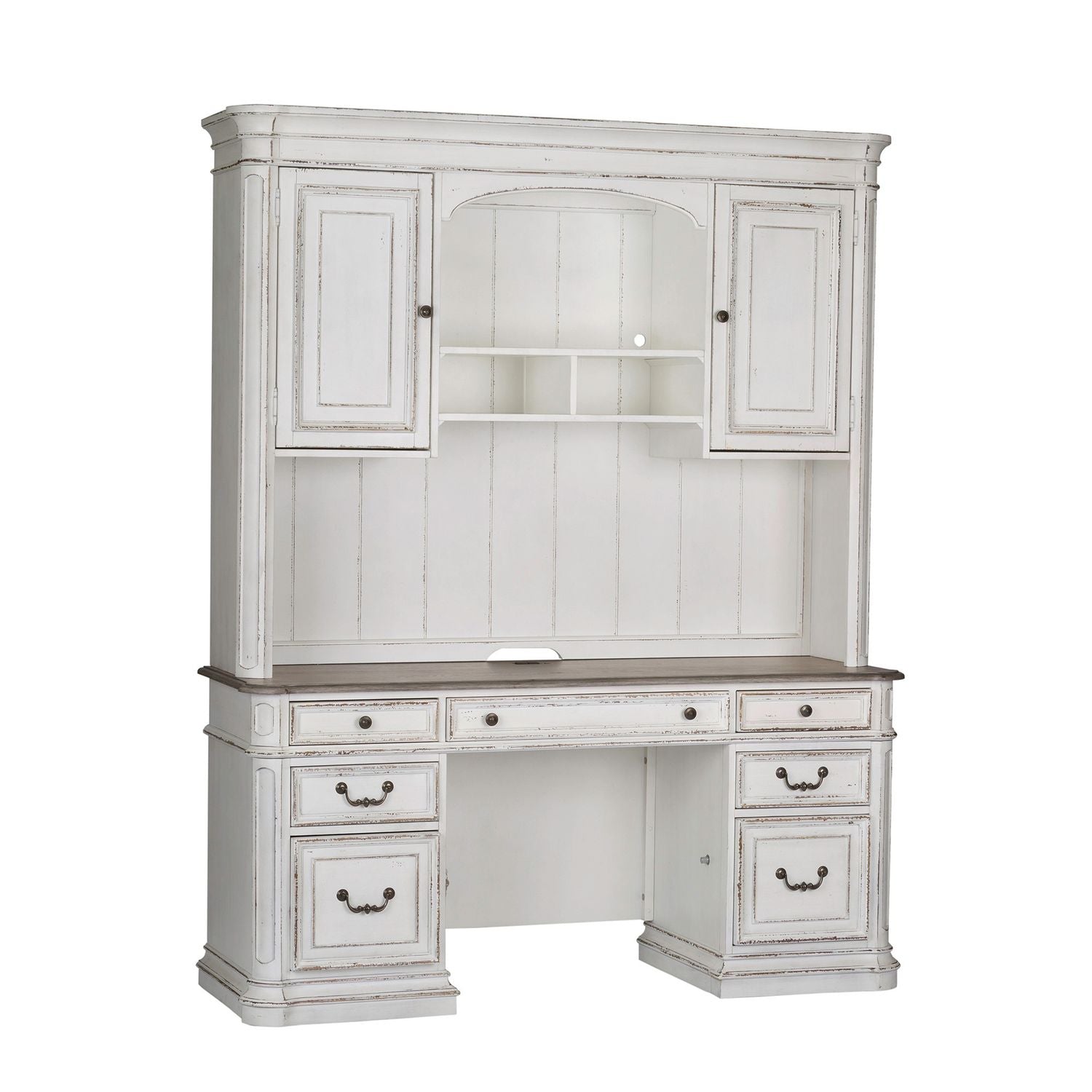 Blend European influences to create the Magnolia Manor credenza and hutch. Crafted with poplar and rubberwood solids with white oak and birch veneers, this piece features framed drawer fronts accented by antique pewter hardware, two large file drawers that can be locked, an open display for storage illuminated by touch lighting, and a flip-down keyboard tray. With today's modern technology in mind, users can enjoy the convenience of the built-in wire management provisions, two outlet ports, and two USB ports. The planked back panel flows throughout the hutch, even behind the two doors where adjustable shelving is located. Warm antique finishes and artistic distressing along with grand scale a group to be passed to generations.