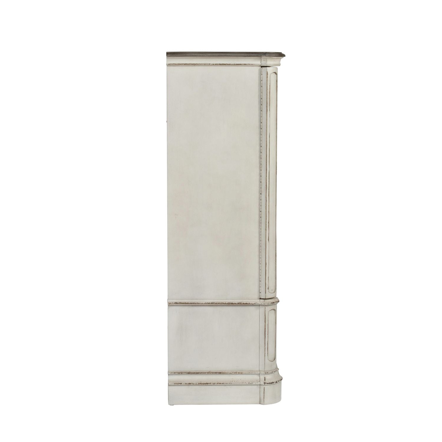 This door chest is the perfect way to accent your room with an effortless blend of European Traditional design. Weathered brown whitewash top paired with the antique white finish creates a truly unique look. Softness is added to the design with canted corners and rounded pilasters, accompanied by bead molding on each drawer front. The chest features 1 fully stained interior drawer, 3 pull out trays, 3 adjustable shelves and is framed by two wrap around doors.