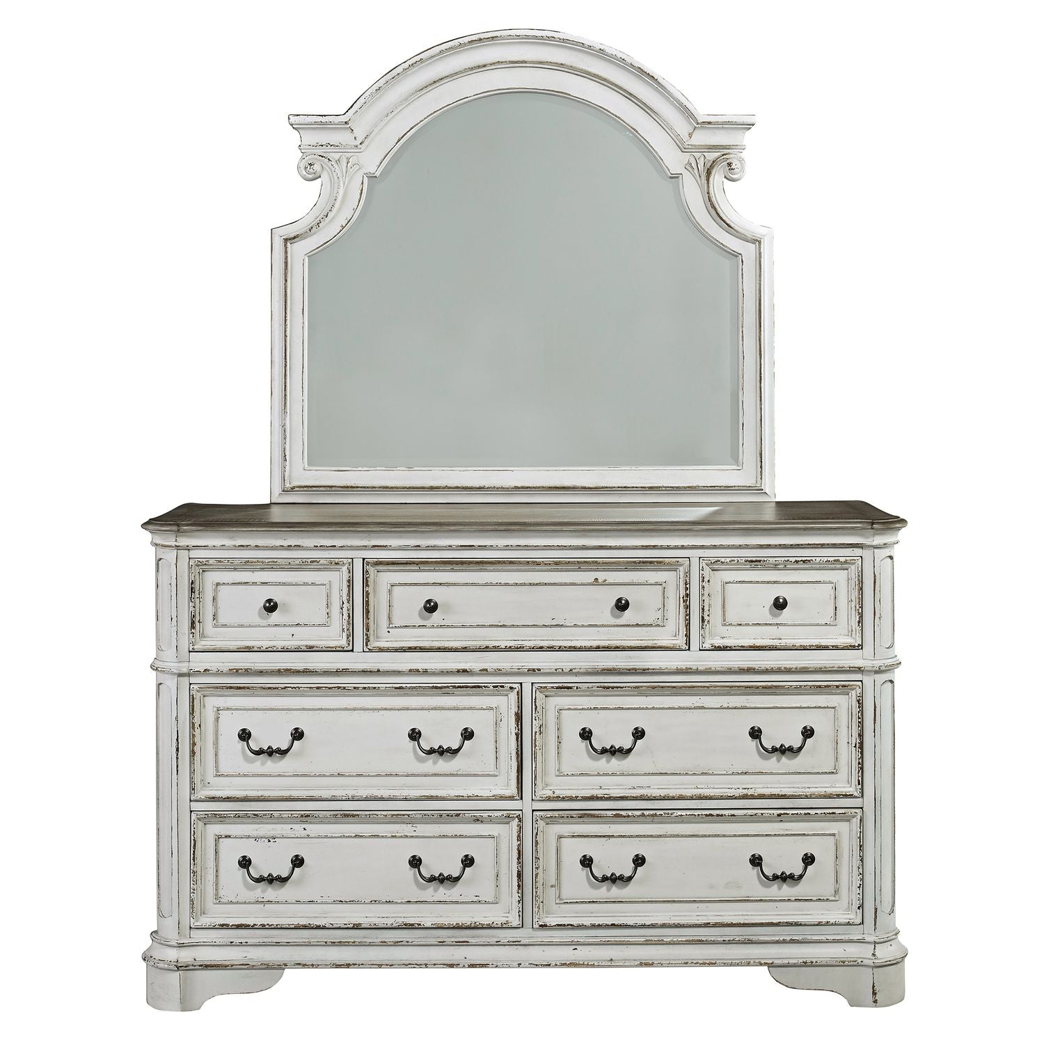 Opt for an elegant display. A refined yet relaxed feel describes the Magnolia Manor California king upholstered sleigh bed, dresser, mirror, chest, and nightstand. Crafted of poplar solids with white oak and birch veneers, this kit features an antique white finish with heavy artistic chipping and weathered brown with whitewash tops. The bed is upholstered in tufted chenille, laced with tone’s of white, tan and brown threading. The rolled upholstered headboard and footboard effortlessly adds both definition and character, completing your look. The dresser and mirror duo are the perfect way to accent your room. Weathered brown whitewash tops paired with the antique white finish creates a truly unique look. Softness is added to the design with canted corners and rounded pilasters, accompanied by bead molding on each drawer front. The dresser, chest, and nightstand feature full extension drawer glides for easy access to storage, fully stained interior drawers, felt lined top drawers, framed drawer fronts, and dust proofed bottom drawers that are accented by antique pewter bail and knob hardware. Warm antique finishes and artistic distressing along with grand scale creates a group to be passed to generations.