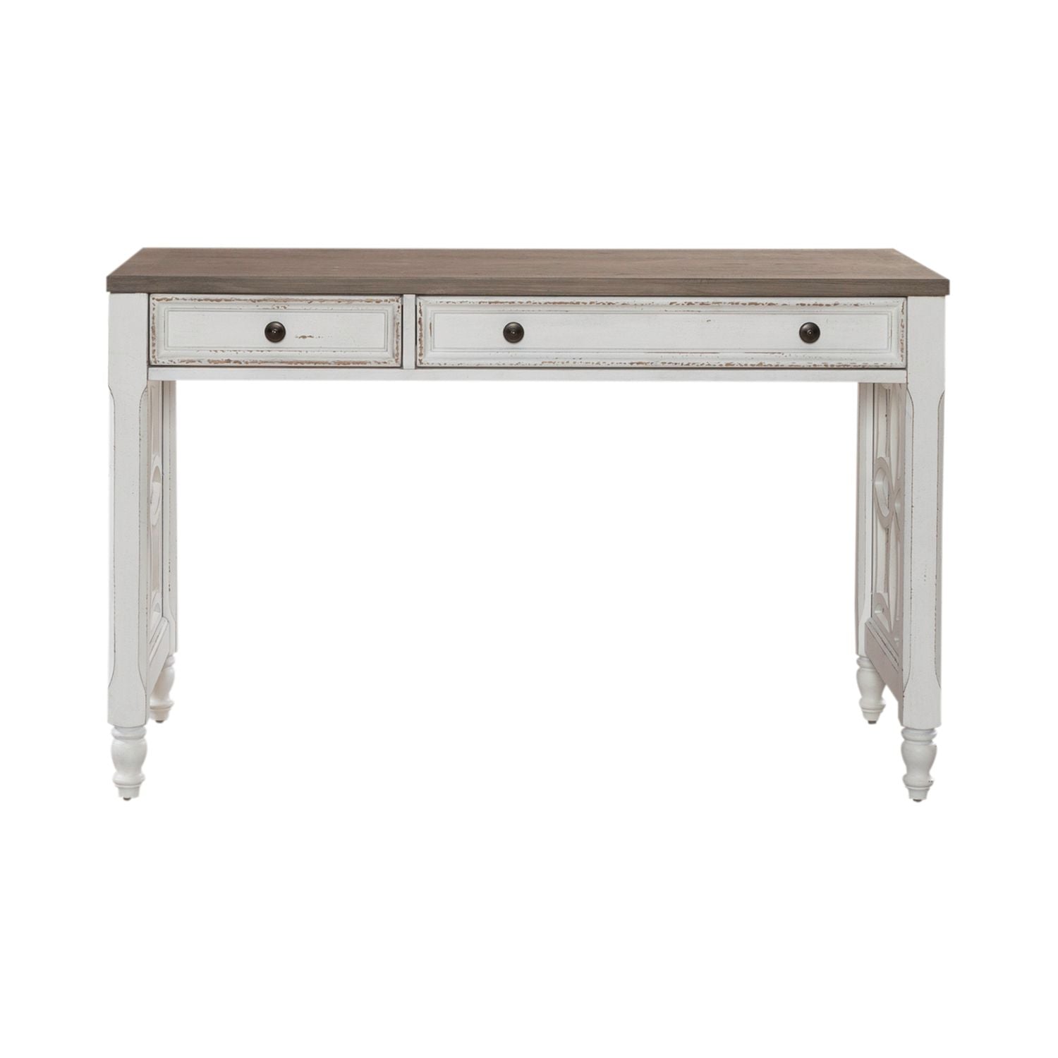 Features one flip down keyboard tray, one full extension drawer, bead molding, a fancy face veneer pattern on top, chamfered legs, and decorative accent side panels. Great for small spaces.