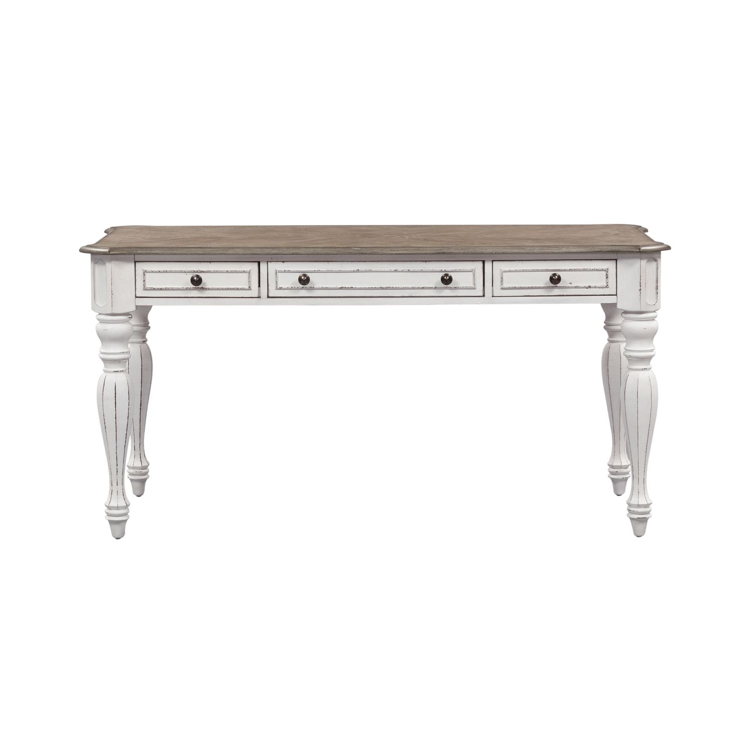 It’s never been easier to be elegant with the Magnolia Manor writing desk. Crafted of poplar and rubberwood solids with white oak and birch veneers, this piece features an antique white finish with heavy chipping and distressing with a weathered brown top with whitewash. The top has a unique fancy face veneer pattern and canted corners. There are three full extension drawers with bead molding, including the center drawer that features a flip-down keyboard tray, all accented with antique pewter knob hardware. The faceted turned legs add character to this desk. Blending of European influences makes Magnolia Manor a truly unique style for any home.