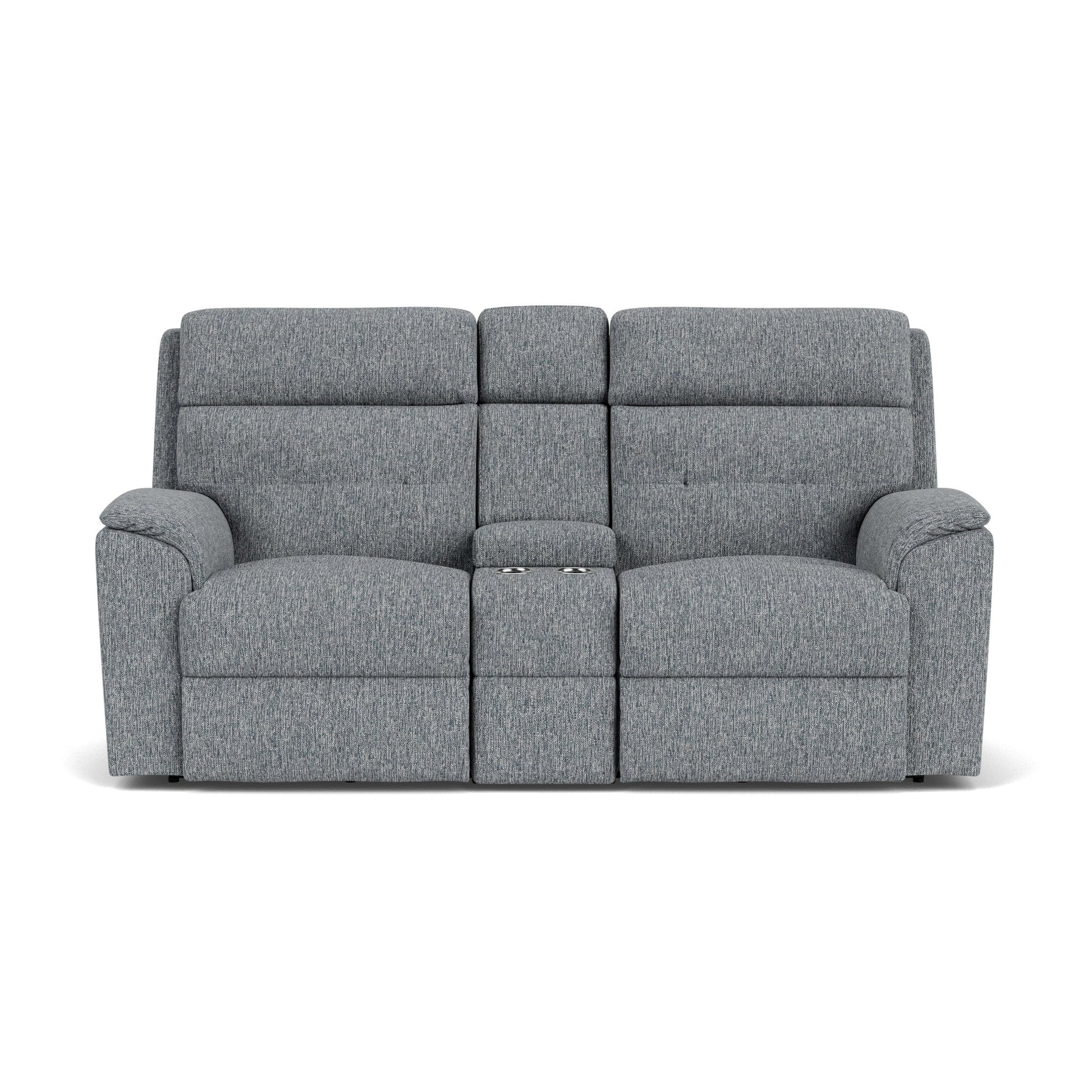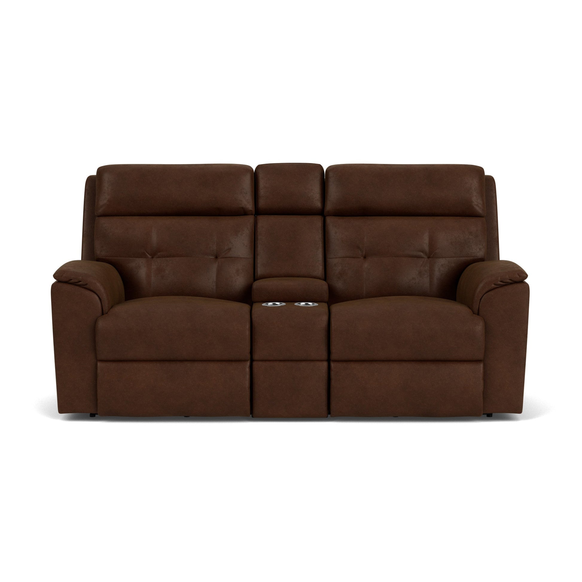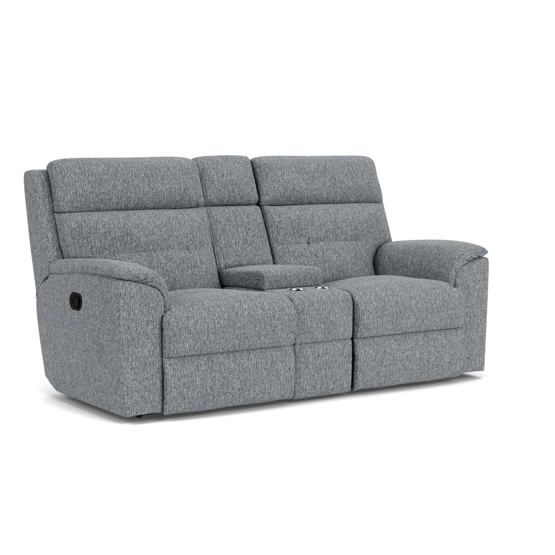 Get cozy in seating built for two with the Mason Reclining Loveseat with Console. A convenient center console gives you plenty of space to keep beverages close by and store remotes, magazines, eyeglasses and more. Adjust the recline with a handle-activated system accessible on both arms. Pad-over armrests provide generous forearm support, while high-divide back cushions take pressure off your head, neck and shoulders. Additional tufting takes pressure off your lower back. Our patented DualFlex Spring System™ bolsters the frame and ensures firmness and flexibility every time you sit, making Mason ideal for active and energetic families. Easy-to-clean fabric—available in over 250 style options—will hold up in busy living spaces.