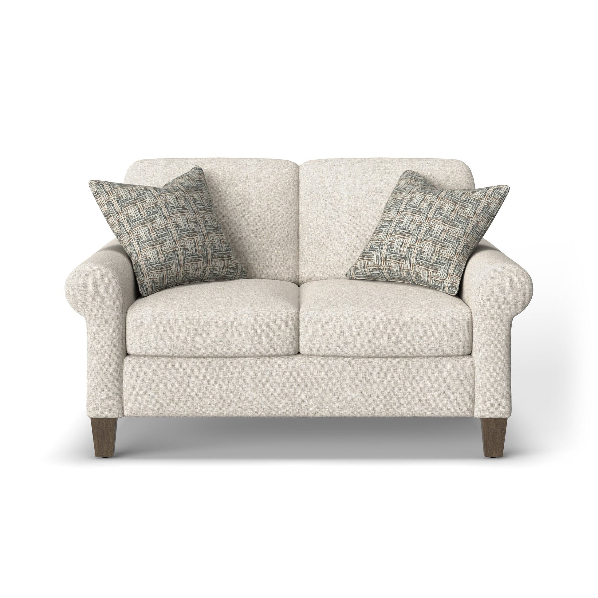 Spirit Meets Style Cozy up with a loved one or claim it all for yourself with the Moxy loveseat that lets you personalize details for the perfect look and feel. A classic silhouette with casual, curved sock arms sits on square tapered legs that are available in three distinct wood finishes—Florentine, Valencia, or Urban Renewal—to complement any décor. The removable square, inside seat cushion style offers you the flexibility to rotate for added longevity. Sink into the ideal level of support with your choice of our luxury or plush cushions. Complete the look and showcase your lifestyle with hundreds of different fabric choices, including high-performance and sustainable textiles. Superior frame construction and our patented C-Flex Blue Steel Spring™ ensures your Moxy can be enjoyed for years to come. A classic silhouette with casual, curved sock arms Off-the-floor square tapered legs come in Valencia, Florentine, or Urban Renewal finishes Semi-attached back cushions remain fixed in place, ensuring a clean look and comfortable feel Removable seat cushions in a classic square style Sit comfortably with luxury cushions featuring a moderately firm polyurethane foam core wrapped with a soft fiber wrap, or select plush cushions featuring a high-resiliency polyurethane foam core wrapped with a soft fiber wrap for added support Built to last with the Flexsteel patented C-Flex Blue Steel Spring™ that provides an elevated level of support Available in hundreds of fabric choices, including those with robust performance and sustainability characteristics Comes with two accent pillows to enhance comfort and style Model Number: 5037-20 Dimensions 37H x 58W x 39L