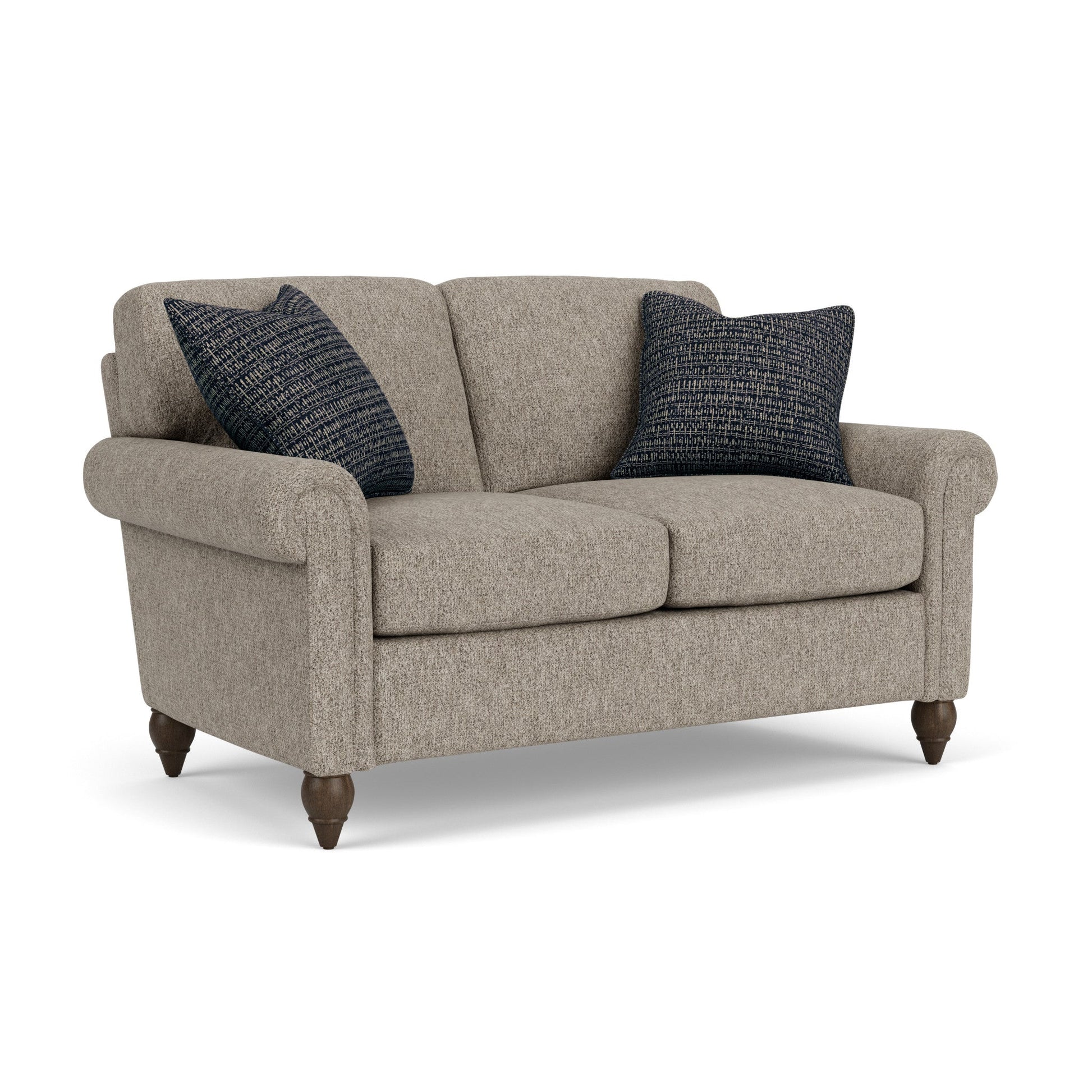 Spirit Meets Style The Moxy loveseat ensures you never have to settle for anything other than the perfect design, no matter your style. Formal panel roll arms sit on round turned legs that are available in three distinct wood finishes—Florentine, Valencia, or Urban Renewal—to complement any décor. The removable square, inside seat cushion style offers you the flexibility to rotate for added longevity. Sink into the ideal level of support with your choice of our luxury or plush cushions. Complete the look and showcase your lifestyle with hundreds of different fabric choices, including high-performance and sustainable textiles. Superior frame construction and our patented C-Flex Blue Steel Spring™ ensures your Moxy can be enjoyed for years to come. Formal panel roll arm style Off-the-floor round turned leg come in Valencia, Florentine, or Urban Renewal finishes Semi-attached back cushions remain fixed in place, ensuring a clean look and comfortable feel Removable seat cushions in a classic square style Sit comfortably with luxury cushions featuring a moderately firm polyurethane foam core wrapped with a soft fiber wrap, or select plush cushions featuring a high-resiliency polyurethane foam core wrapped with a soft fiber wrap for added support Built to last with the Flexsteel patented C-Flex Blue Steel Spring™ that provides an elevated level of support Available in hundreds of fabric choices, including those with robust performance and sustainability characteristics Comes with two accent pillows to enhance comfort and style Model Number: 5038-20 Dimensions 37H x 58W x 39L