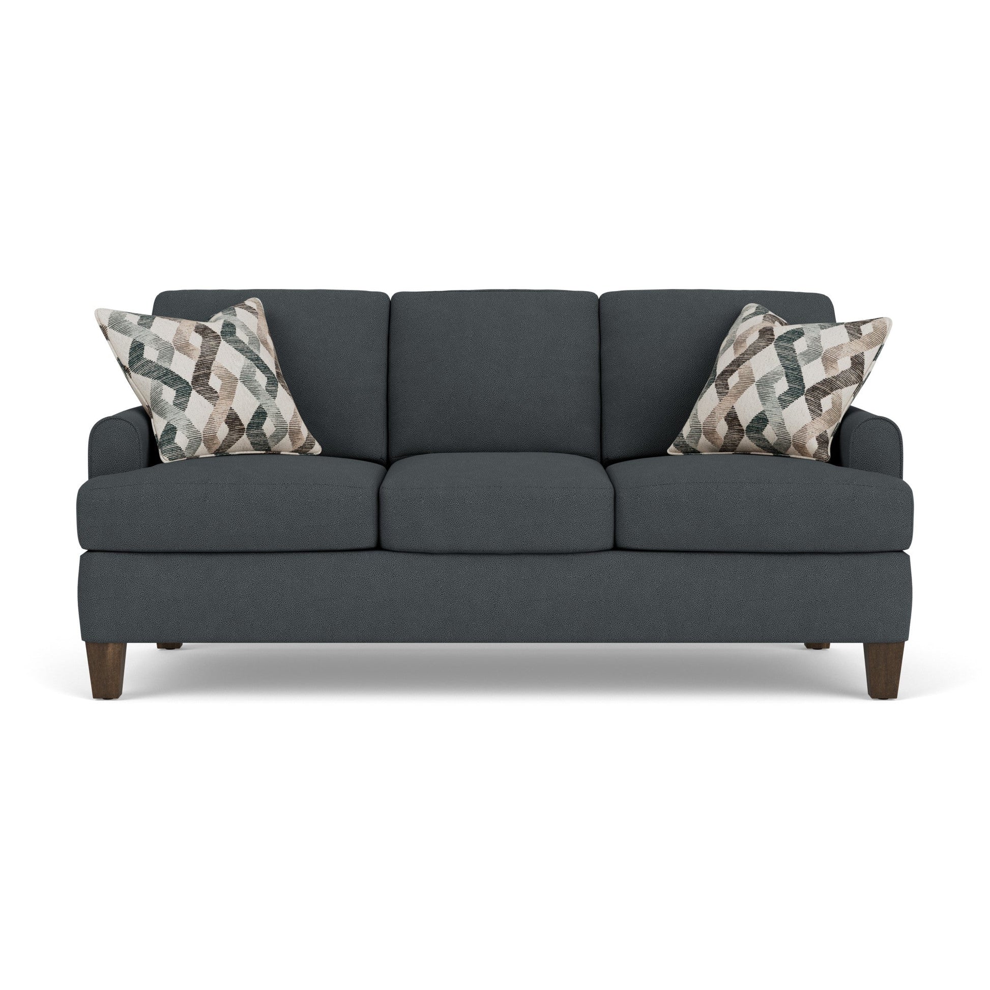 Spirit Meets Style The Moxy sofa ensures you never have to settle for anything other than the perfect design, no matter your style. Rounded mailbox arms provide a clean look. Square tapered legs come in your choice of three distinct wood finishes—Florentine, Valencia, or Urban Renewal—to complement any décor. The removable T-shaped seat cushions offer a distinctive look and added comfort. Sink into the ideal level of support with your choice of our luxury or plush cushions. Complete the look and showcase your lifestyle with hundreds of different fabric choices, including high-performance and sustainable textiles. Superior frame construction and our patented C-Flex Blue Steel Spring™ ensures your Moxy can be enjoyed for years to come. Rounded mailbox arms provide a contemporary look Off-the-floor square tapered legs come in Valencia, Florentine, or Urban Renewal finishes Semi-attached back cushions remain fixed in place, ensuring a clean look and comfortable feel Removable seat cushions in a distinctive T-shaped style Sit comfortably with luxury cushions featuring a moderately firm polyurethane foam core wrapped with a soft fiber wrap, or select plush cushions featuring a high-resiliency polyurethane foam core wrapped with a soft fiber wrap for added support Built to last with the Flexsteel patented C-Flex Blue Steel Spring™ that provides an elevated level of support Available in hundreds of fabric choices, including those with robust performance and sustainability characteristics Comes with two accent pillows to enhance comfort and style Model Number: 5019-31 Dimensions 37H x 81W x 39L