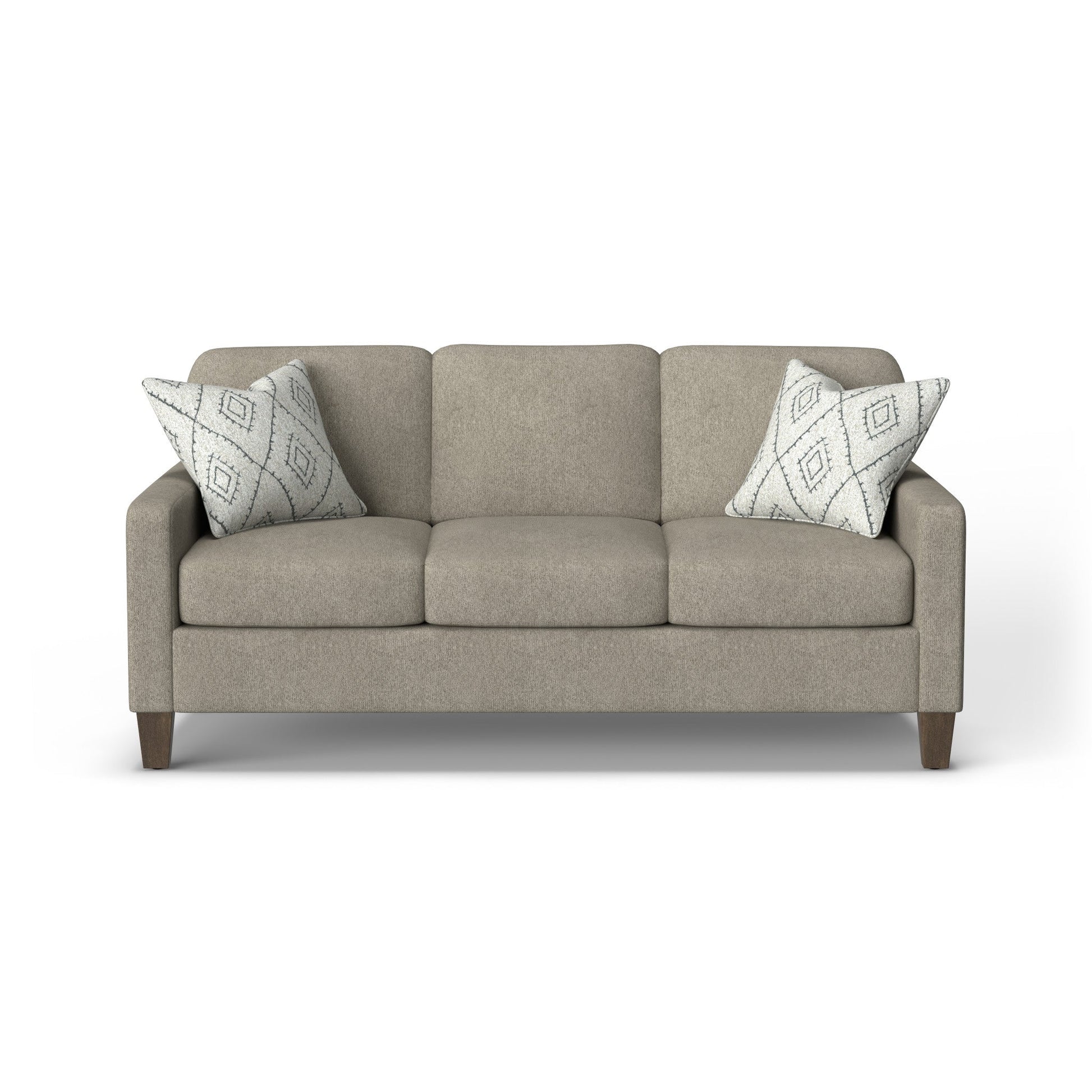 Spirit Meets Style Cozy up with a loved one or claim it all for yourself with the Moxy sofa that lets you personalize details for the perfect look and feel. Straight track arms provide a clean look. Square tapered legs come in your choice of three distinct wood finishes—Florentine, Valencia, or Urban Renewal—to complement any décor. The removable square, inside seat cushion style offers you the flexibility to rotate for added longevity. Sink into the ideal level of support with your choice of our luxury or plush cushions. Complete the look and showcase your lifestyle with hundreds of different fabric choices, including high-performance and sustainable textiles. Superior frame construction and our patented C-Flex Blue Steel Spring™ ensures your Moxy can be enjoyed for years to come. Straight track arms provide a contemporary look Off-the-floor square tapered legs come in Valencia, Florentine, or Urban Renewal finishes Semi-attached back cushions remain fixed in place, ensuring a clean look and comfortable feel Removable seat cushions in a classic square style Sit comfortably with luxury cushions featuring a moderately firm polyurethane foam core wrapped with a soft fiber wrap, or select plush cushions featuring a high-resiliency polyurethane foam core wrapped with a soft fiber wrap for added support Built to last with the Flexsteel patented C-Flex Blue Steel Spring™ that provides an elevated level of support Available in hundreds of fabric choices, including those with robust performance and sustainability characteristics Comes with two accent pillows to enhance comfort and style Model Number: 5035-31 Dimensions 37H x 82W x 39L