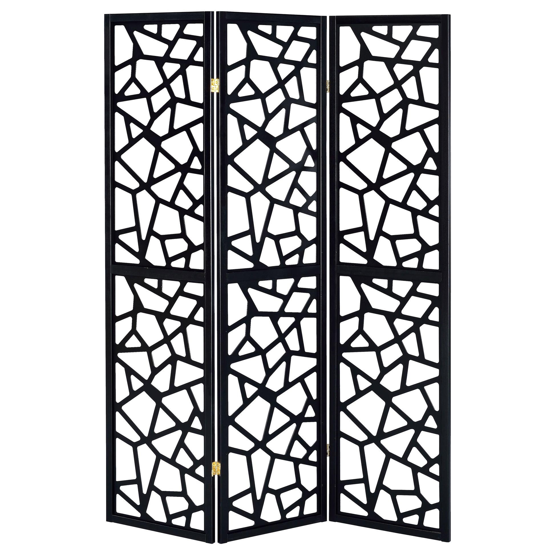 • Three-panel room divider with a bold open mosaic pattern for modern appeal