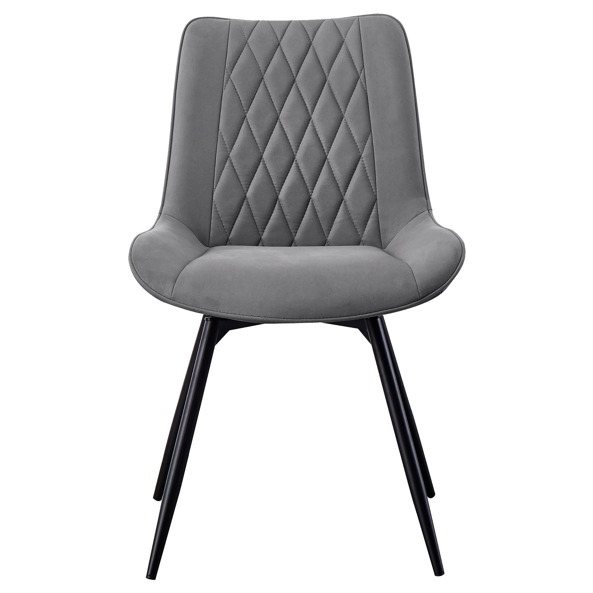 • Side chairs feature foam-padded seat, upholstered with soft gray fabric and quilting detail, swivel mechanisms, and round, tapered legs