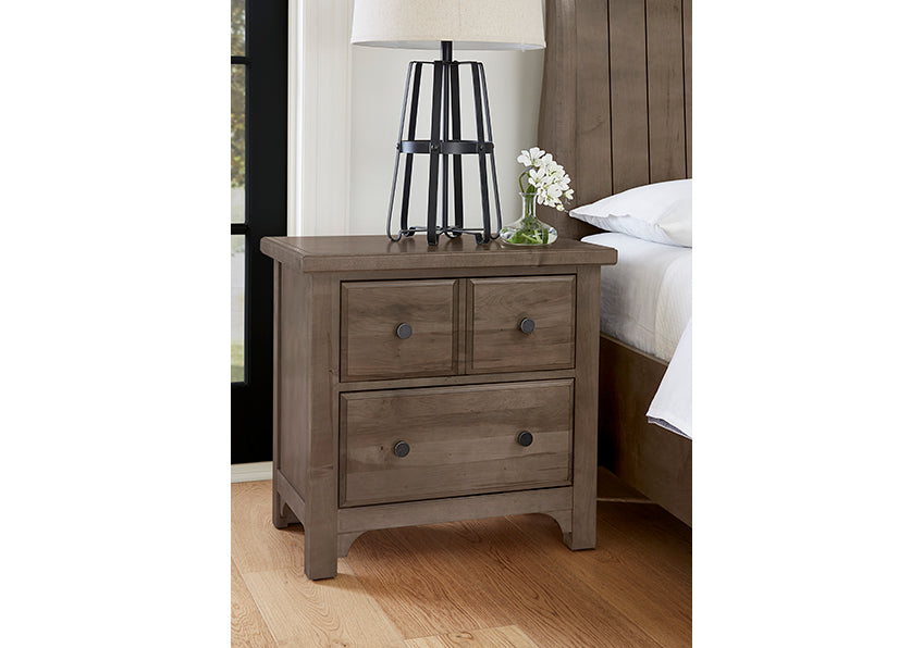 2 drawer nightstand crafted of North American maple solids and veneers. Featuring clean lines and natural finishes with custom burnished pewter coin-edged pulls.