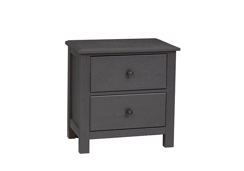 Made in the USA; this night stand has two drawers shown in a graphite finish offers casual style to any bedroom in your home. Made from solid American White Oak. Available in 5 quick ship finishes.