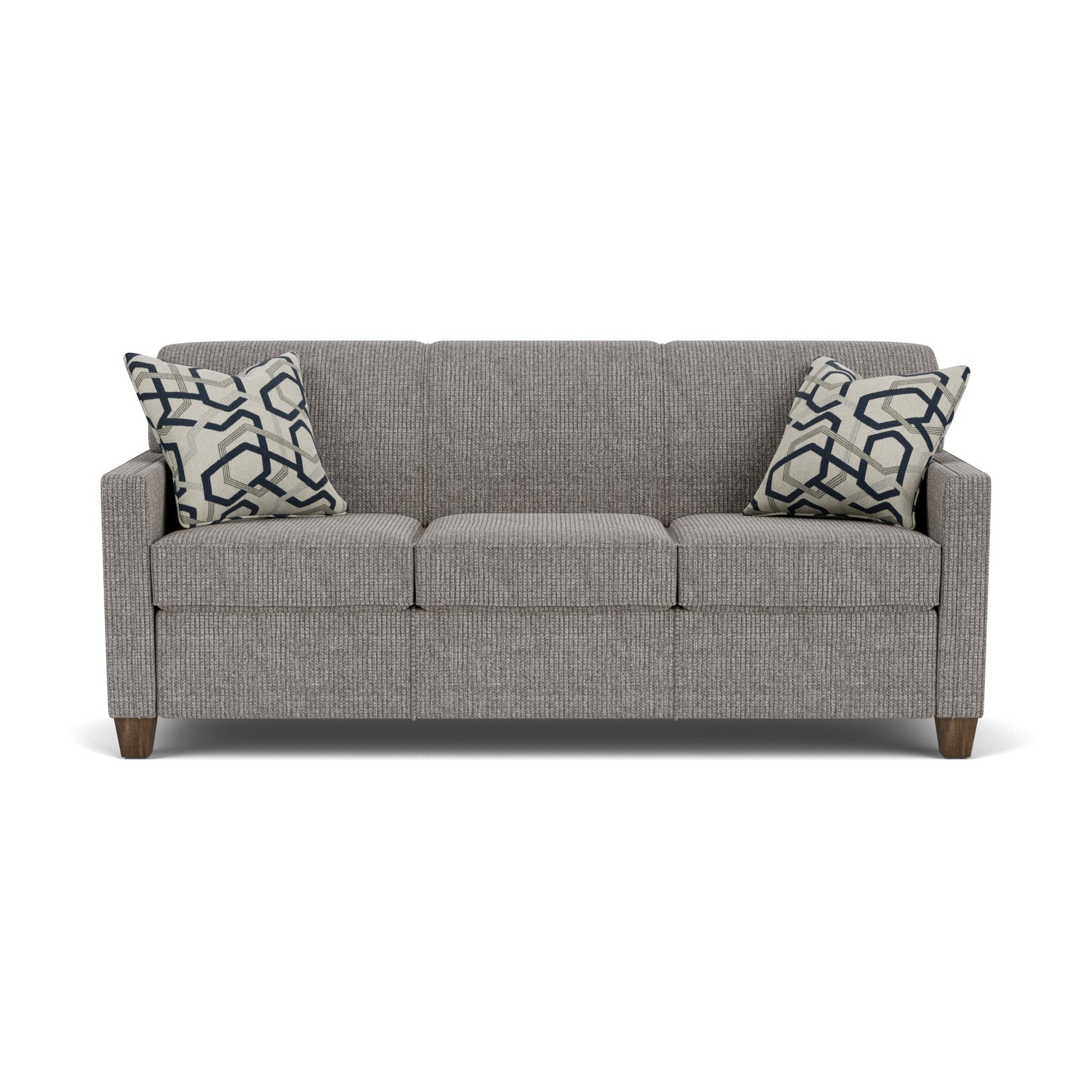 Easy Elegance Built for unrivaled comfort and classic style, the Nora sofa features a tightly padded back, refined track arms, and square tapered wood legs for a clean and tailored silhouette that invites relaxation or conversation. Soft, reversible box seat cushions are accentuated with an elegant welt trim detail, while two accent pillows in a coordinating fabric complete the look. Modestly scaled, Nora’s streamlined design lends openness to any size space. Small-scale piece perfect for compact spaces Built to last with the C-Flex Blue Steel Spring™ Clean, tailored tight back for firm support Design-forward details including refined track arms and welt trim Square tapered wood legs in attractive Florentine finish offer understated style Comes with two accent pillows to enhance comfort and style Comfortably seats three Model Number: 5890-31 Dimensions 36H x 77W x 35L