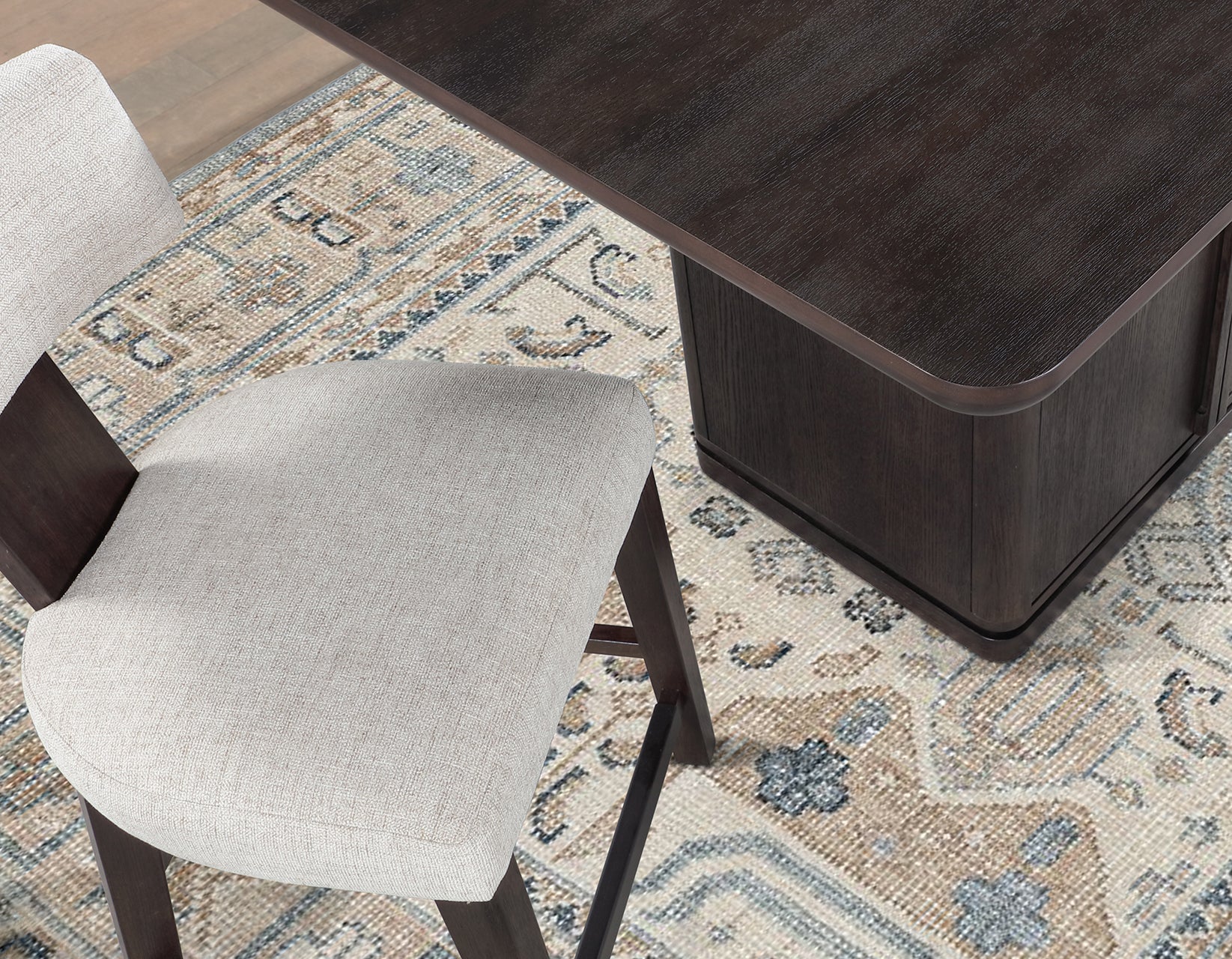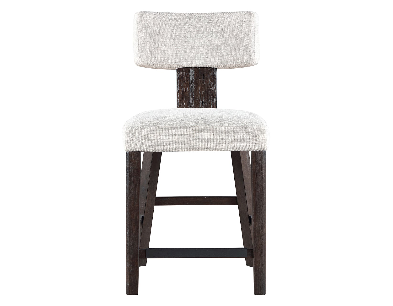 Styled for today’s 36″-high kitchen counters, the Oakley 24″ Counter Stool delivers sleek comfort with a modern edge. A floating barrel-style backrest, supported by exposed wood posts, combines ergonomic support with visual appeal. The 5.5″ thick seat cushion, upholstered in light gray herringbone polyester, offers plush comfort for everyday use. Reinforced front and side stretchers enhance durability and double as a convenient footrest. Finished in a rich charcoal brown, Oakley brings modern style, lasting comfort, and smart functionality to any kitchen or dining space.