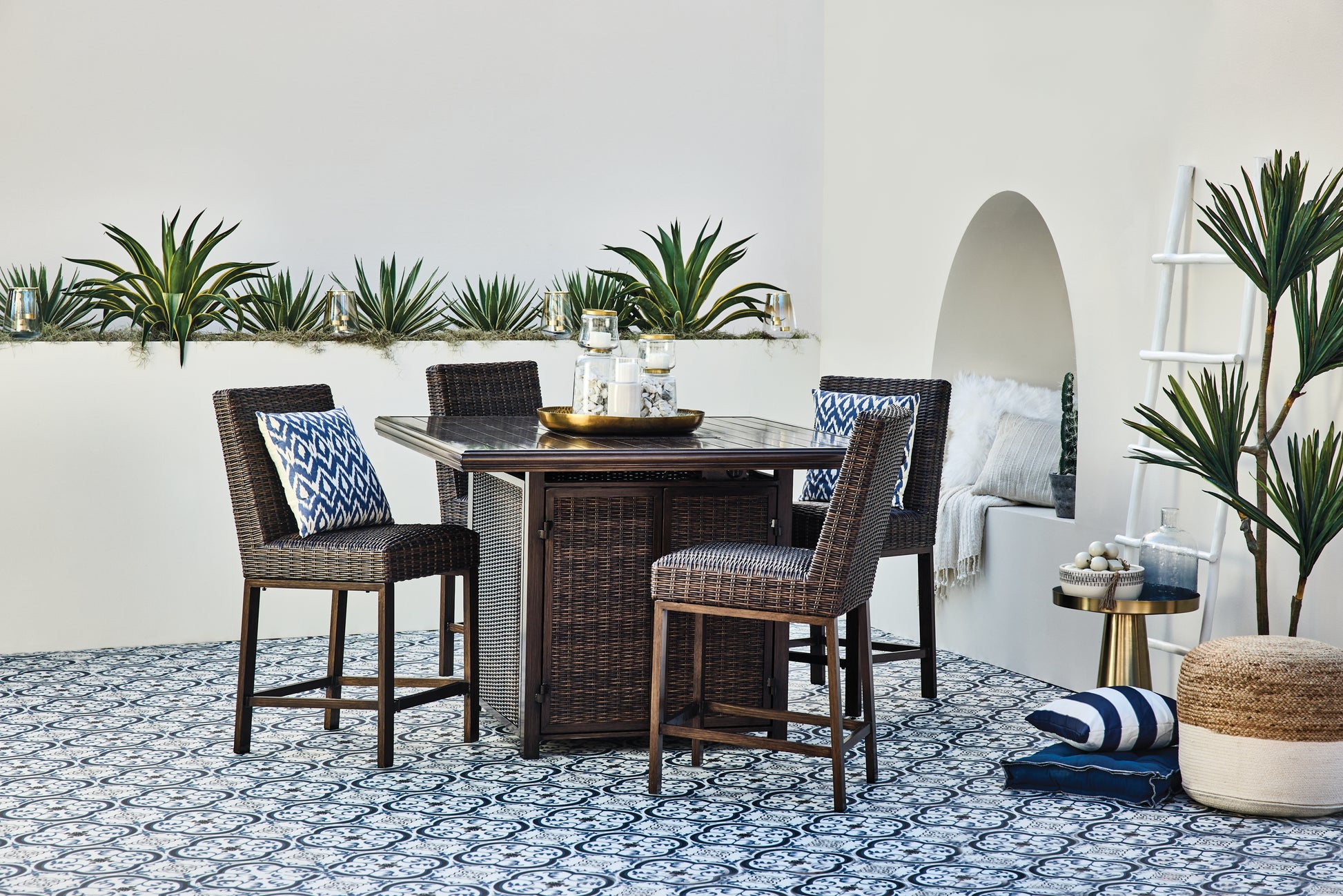 | Details | Includes fire pit table and 4 bar stools, Made with all-weather resin wicker handwoven over rust-free aluminum frame , Table has wood-look top; side panels accented with all-weather, handwoven resin wicker , Bar stool has aluminum legs with wood look finish; comfortable footrest, High-density foam layered under the seat, Stainless steel hardware, Gas fire pit table features CSA-approved 55,000 BTU stainless steel burner, glass beads, burner cover and all-weather protective cover, Battery-operated ignition system with adjustable flame control; battery included, Door conceals gas propane tank (not included) and storage area with 2 shelves, Assembly of fire pit table provided with in-home delivery; connection to propane tank or connector hose not provided; convertible to natural gas, Accommodates up to 8, Designed to withstand the harsh elements of the outdoors, Assembly required | |