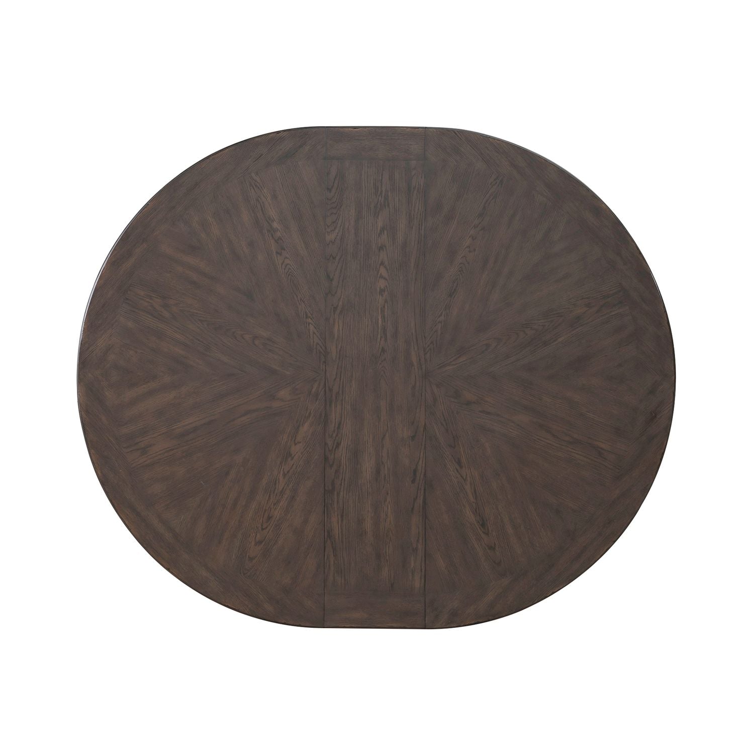 Forget dining out and make your home the best place to enjoy a meal with the Paradise Valley pedestal table set. Crafted with excellence using Rubberwood solids and Split Heart White Oak veneers, this table features a Saddle Brown finish. The round pedestal table offers a twelve inch removable leaf on an Easy Glide leaf track system. The starburst veneer pattern and the bead molding along the table apron is sure to draw the eye to the square turned pedestal base supported by shaped bracket feet. The Paradise Valley pedestal table set captures grand opulence with comfortable rustic styling.