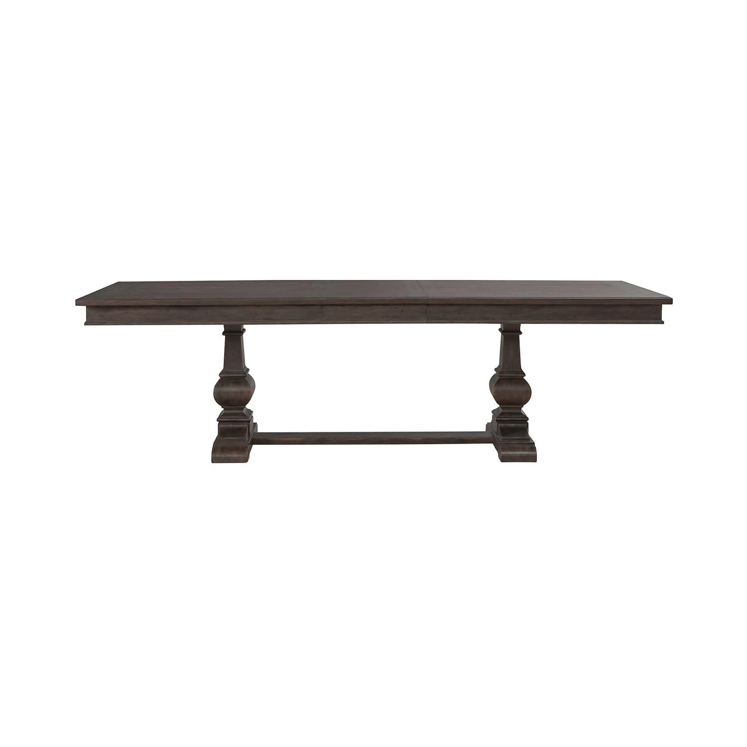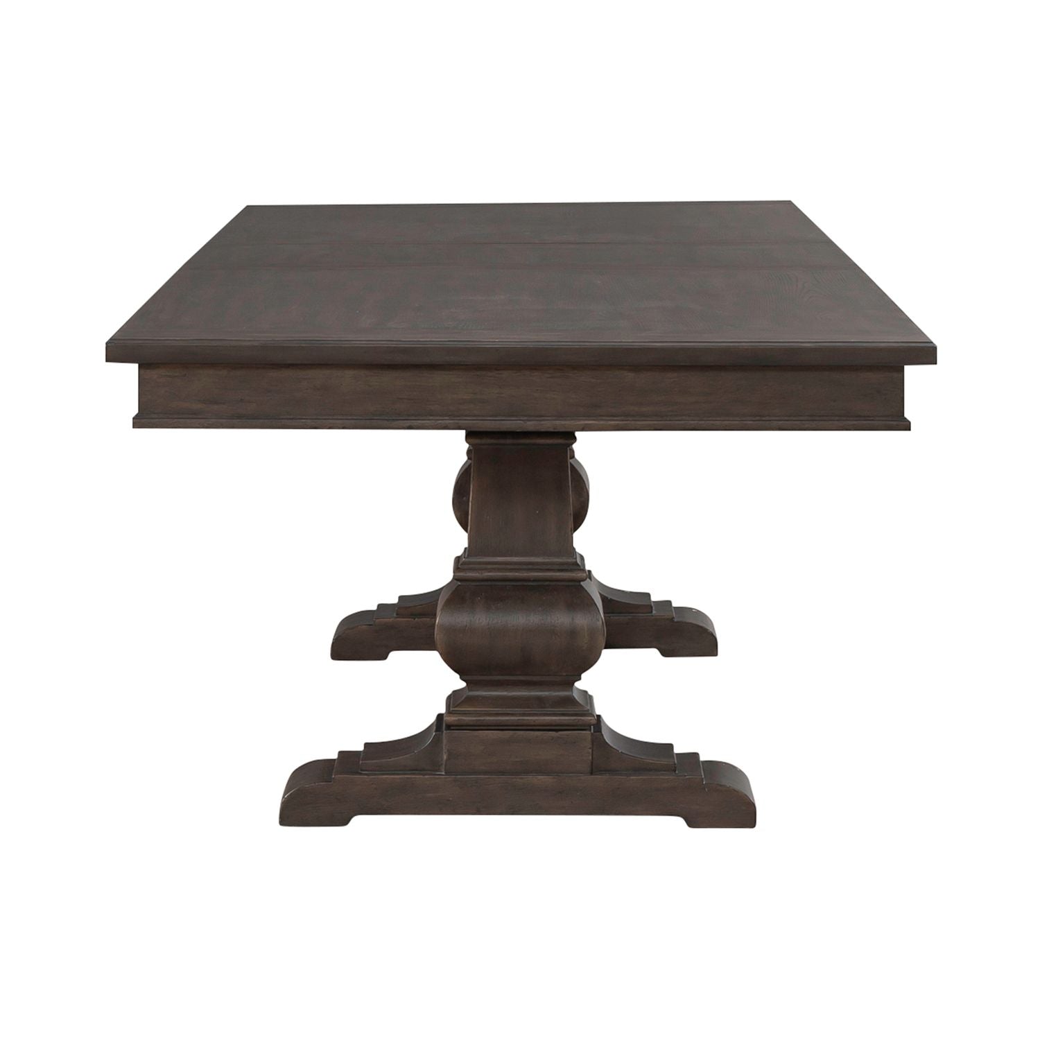 Forget dining out and make your home the best place to enjoy a meal with the Paradise Valley trestle table set. Crafted with excellence using Rubberwood solids and Split Heart White Oak veneers, this table features a Saddle Brown finish. The trestle table offers plenty of room to expand with the removable eighteen inch leaf on an Easy Glide leaf track system. Bead molding runs along the apron of the table that is sure to draw the eye to the double square turned pedestals supported by shaped bracket feet and a center trestle. The ends of the table top feature a bread board veneer pattern for an added design element. The Paradise Valley trestle table set captures grand opulence with comfortable rustic styling.
