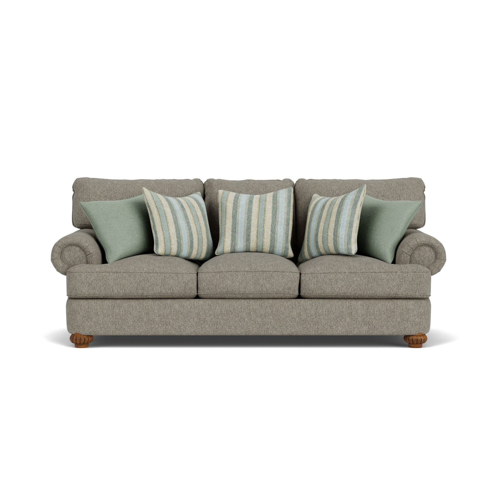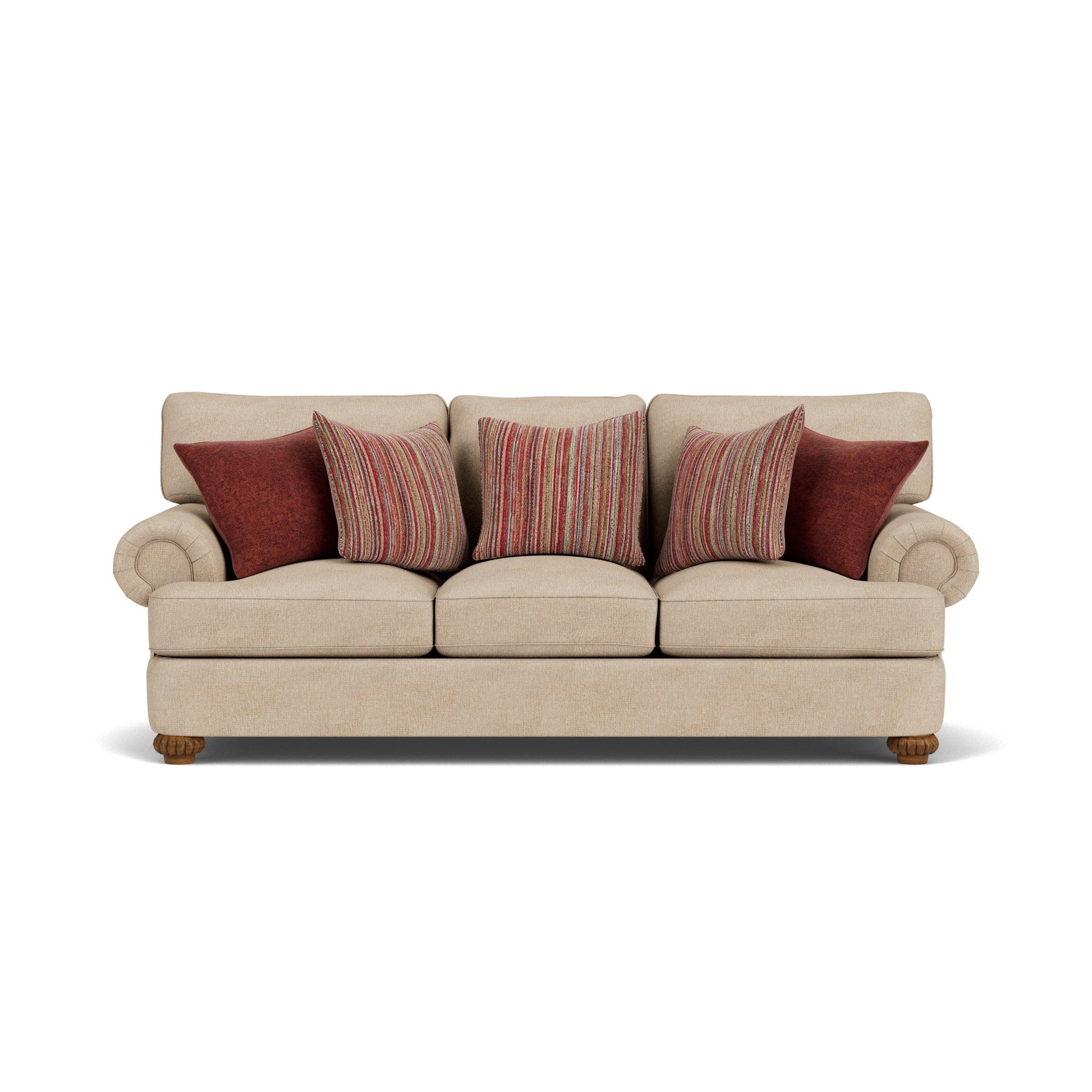 Generous proportions in an elegant design Prominently rolled arms and a padded front rail give Patterson its welcoming appearance. Overstuffed seat and back cushions on a large frame make it difficult to resist curling up on this piece. Fluted bun feet and optional nailhead trim add the finishing touches to Patterson. Also available with nailhead trim. Model Number: 7321-31 Dimensions 40H x 96W x 42L
