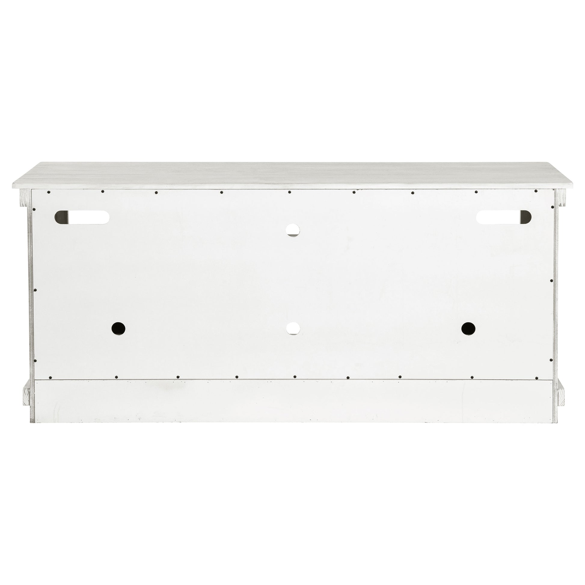 Complete a media center in your inviting home with a modern farmhouse TV stand. It's an approachable design with roughhewn wood details that create texture and dimensionality in your living space. Two shelves and six compartments create ample storage, perfect for everything from peripherals and accessories to personal decor. The media console features a clean-lined silhouette with a slim profile, perfect for a flat panel or wall-mounted television. This TV stand accommodates televisions up to 65 inches.