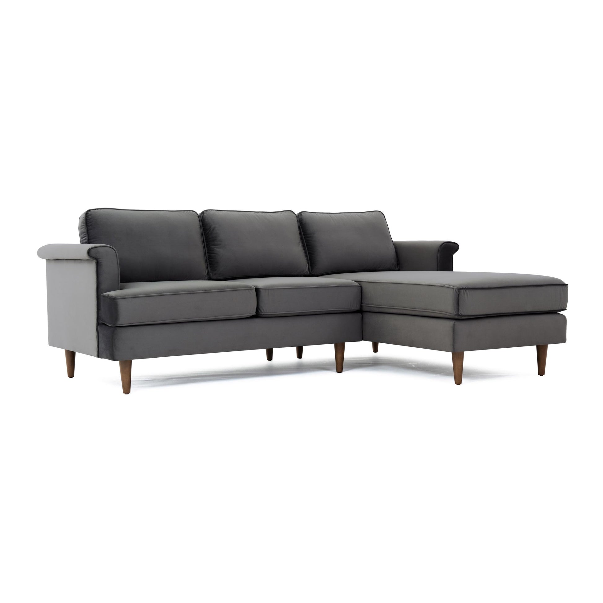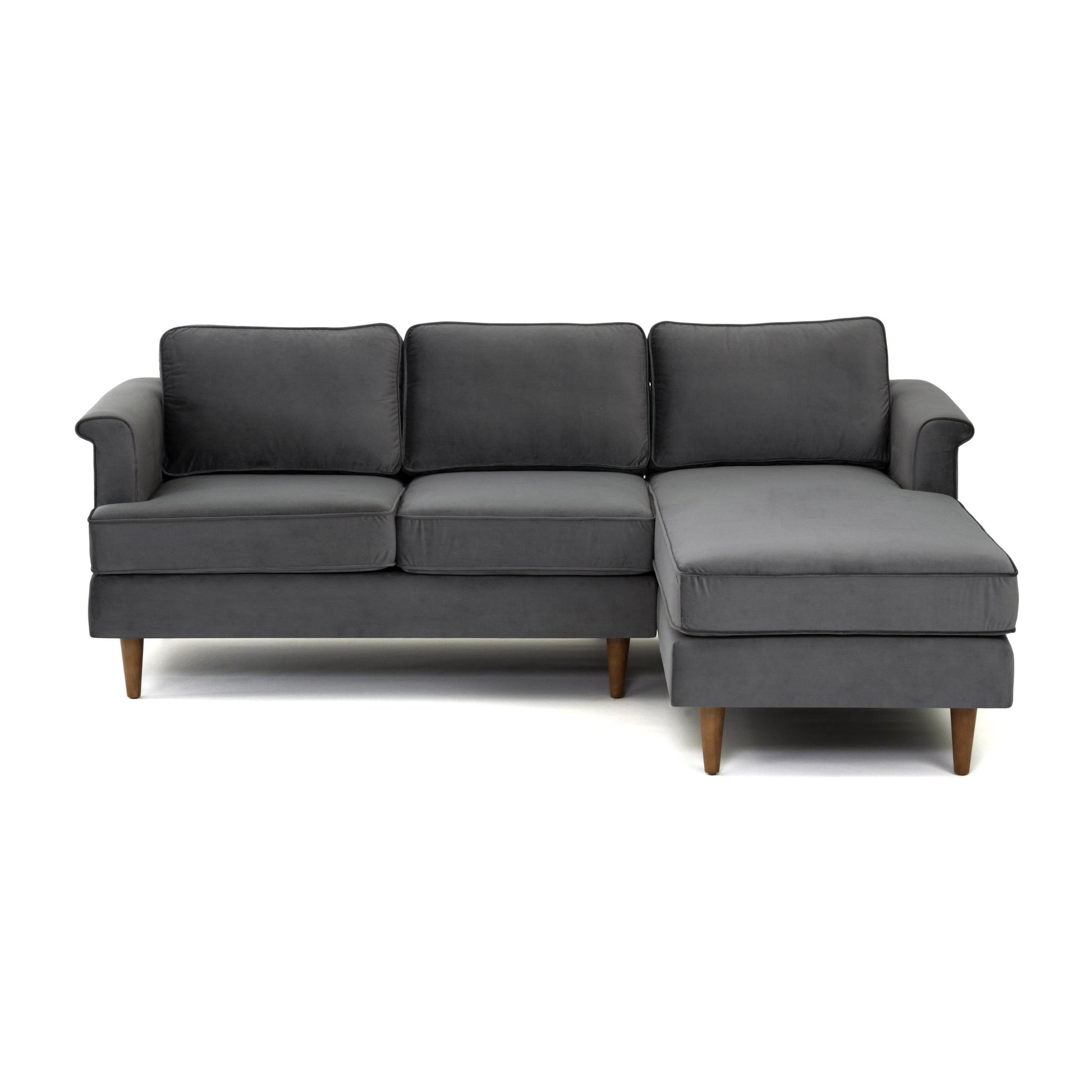 Mid-century modern is a classic design and the Porter sectional reinforces its allure. It offers timelessness and comfort with its removable cushions, sumptuous velvet upholstery, sturdy birch wood frame, and elegant rolled arms. This splendid sectional is available in grey or forest green options and either RAF or LAF configuration.