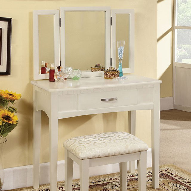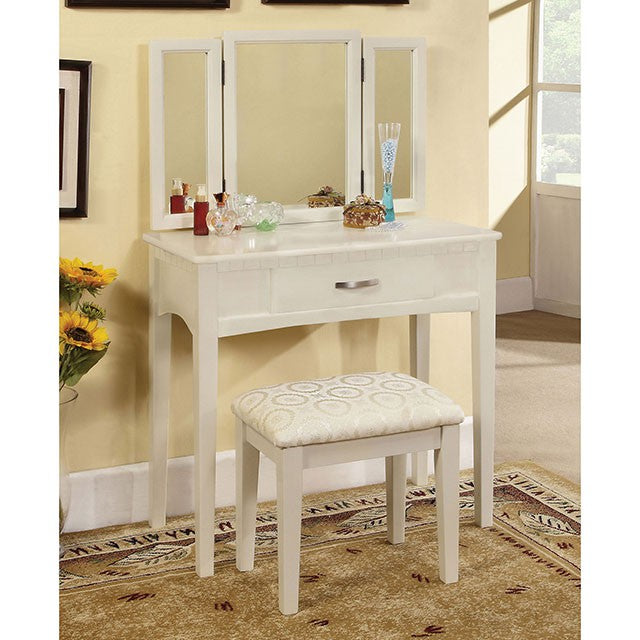 | Dimensions | TABLE: 32"L X 16"W X 30"H, MIRROR: 30 1/4"L X 20 1/2"W X 3/4"H, STOOL: 18 1/4"L X 13"W X 17 1/2"H | |