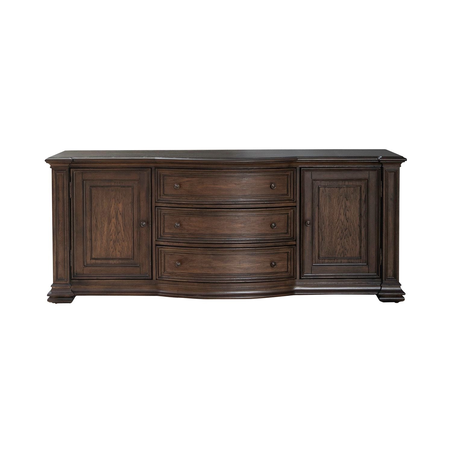 The Provence Park 78 inch TV console is a harmonious blend of elegance and functionality that redefines your entertainment space with timeless design. Meticulously crafted with Rubberwood solids and Split Heart Hickory veneers, this piece features a Chateau Brown finish. The serpentine shaping on the front of the case immediately captivates, introducing a graceful curvature that adds a touch of uniqueness to the console. The three drawers and two doors, framed with bead molding accents, showcase meticulous craftsmanship, creating a cohesive and refined look. Square block pilasters, adorned with graduated bead molding, stand tall and proud, adding depth and dimension to the console's design. These pilasters not only provide visual interest but also contribute to the overall flow of the piece, creating a sense of continuity. The square turned bun feet offer a sturdy foundation while maintaining the classic design aesthetic. One adjustable shelf behind each door ensures customizable storage, and wire management provisions add a touch of practicality, keeping your entertainment area organized and clutter-free. Elevate your entertainment space with the visually stunning Provence Park 78 inch TV console.