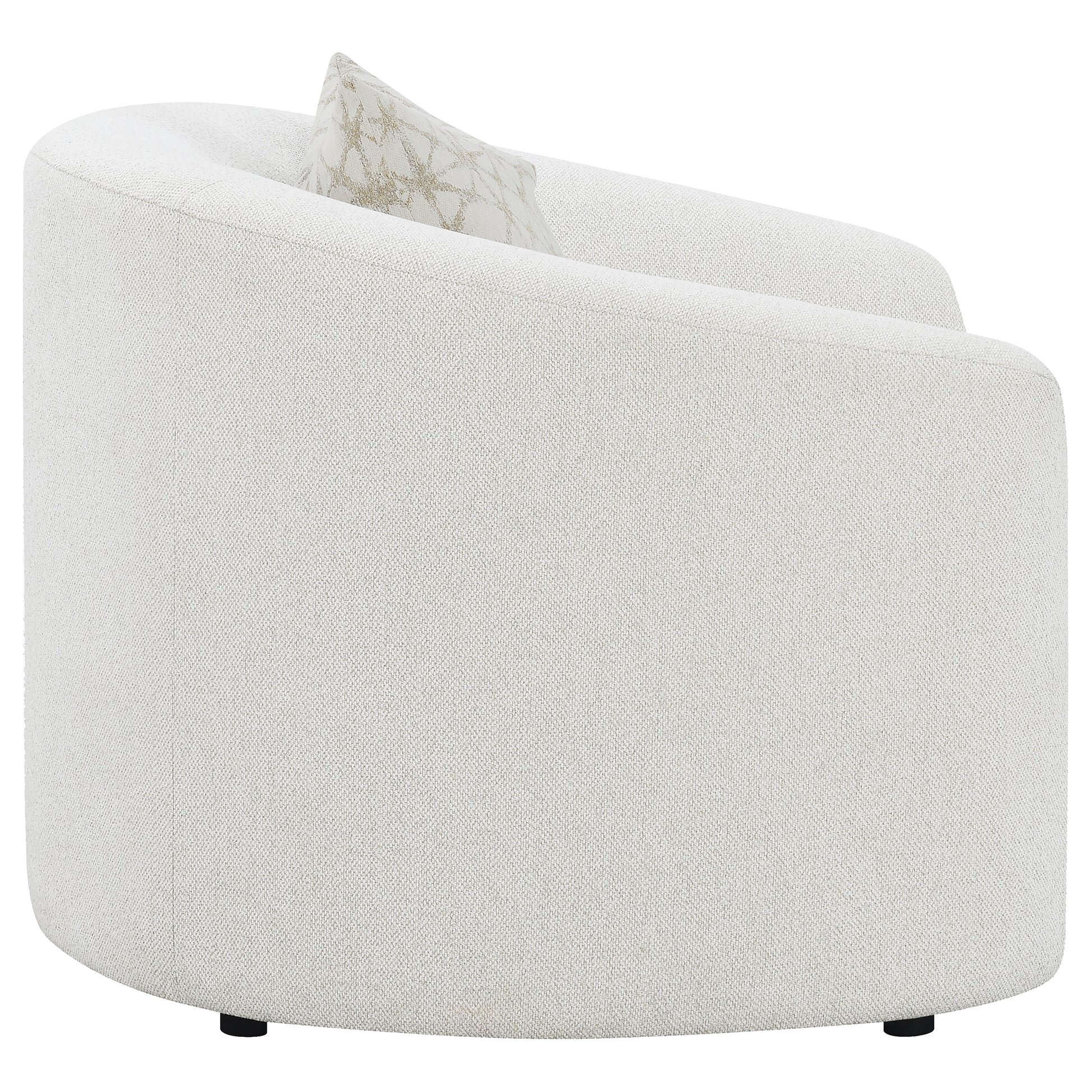 • Accent chair wrapped in soft latte boucle upholstery for texture