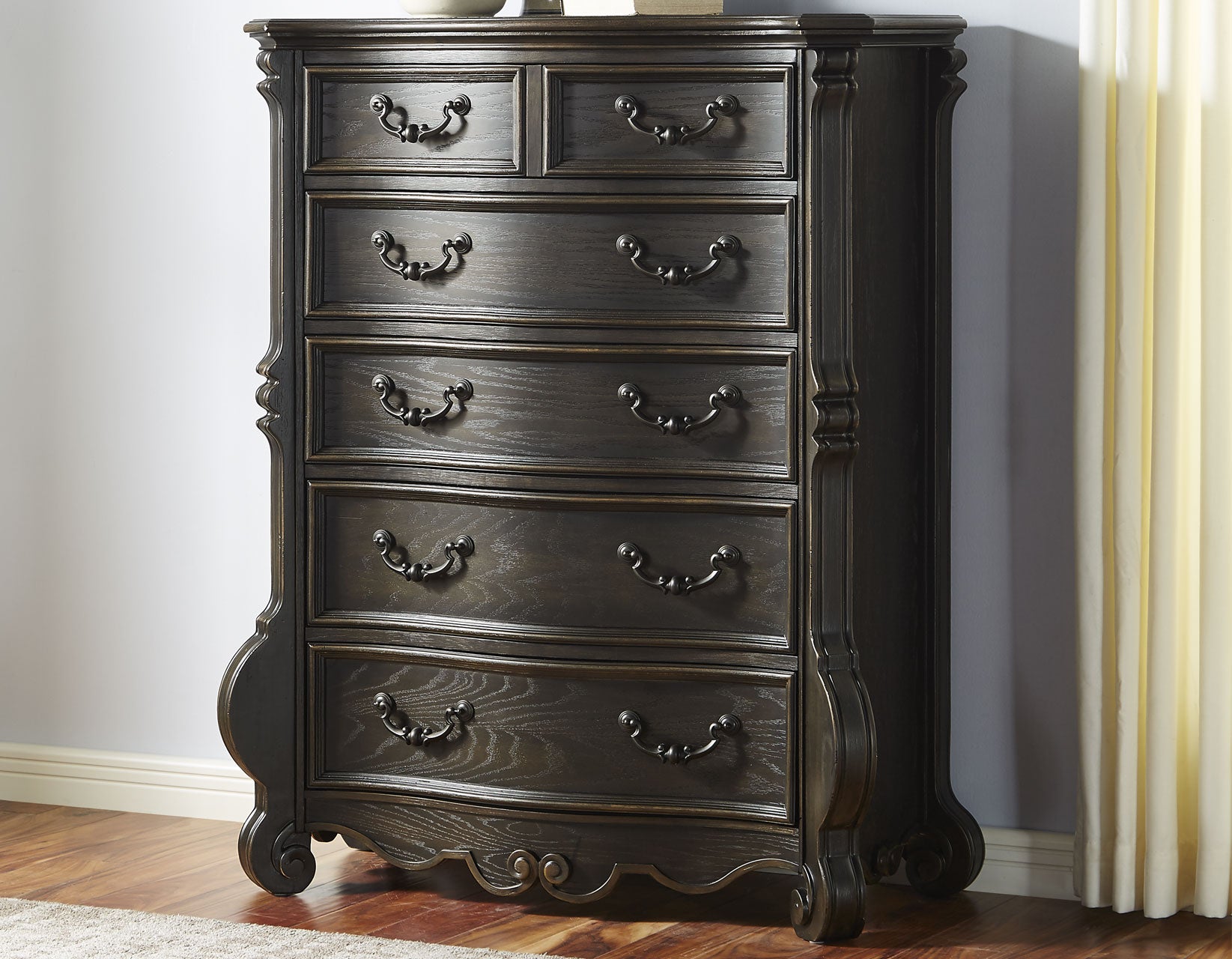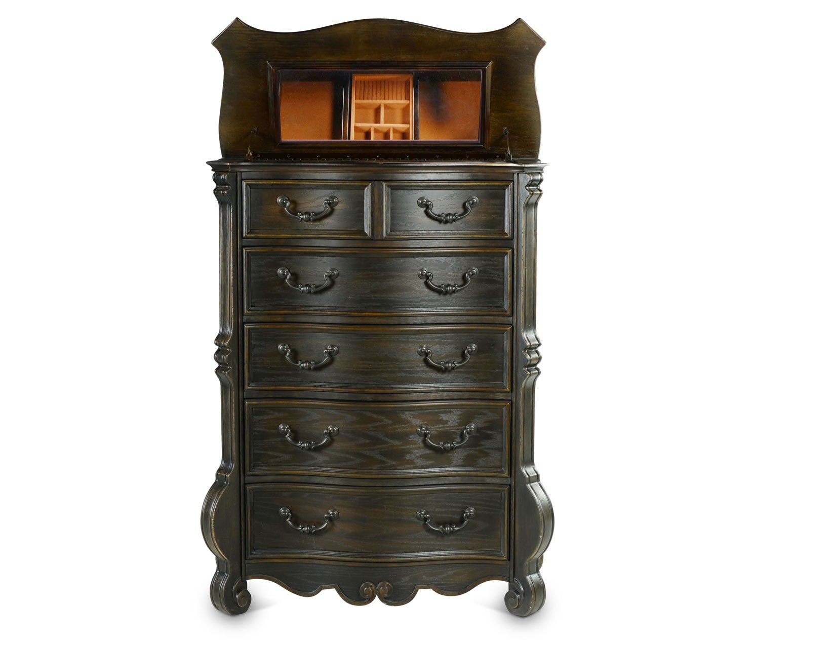 Rhapsody presents a comfortable and opulently traditional style with this Chest. The Chest sets the tone for this collection with fluted pilasters, scrollwork and elevated feet. The multi-step molasses finish features edge rubthrough that replicates the look of a loved heirloom antique.