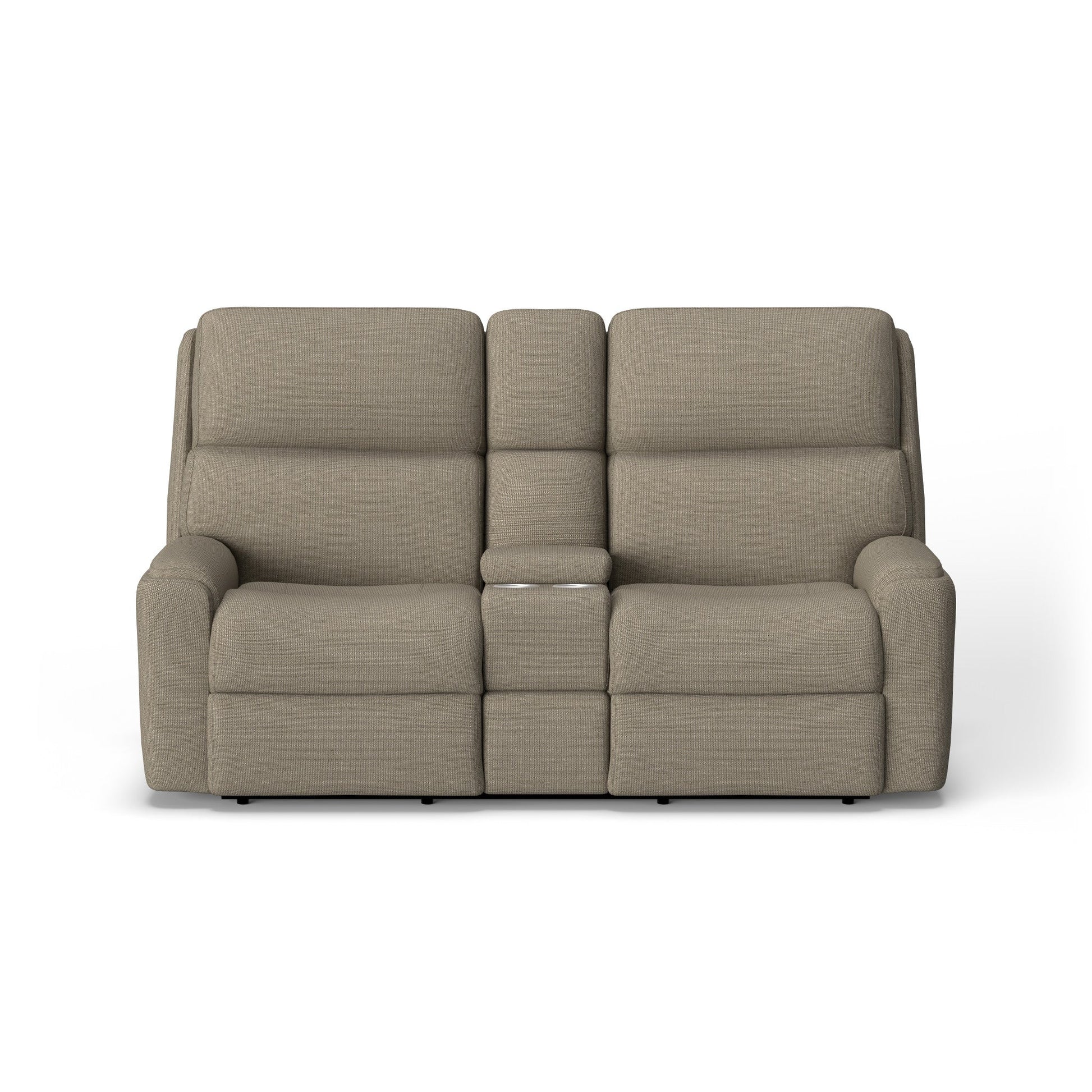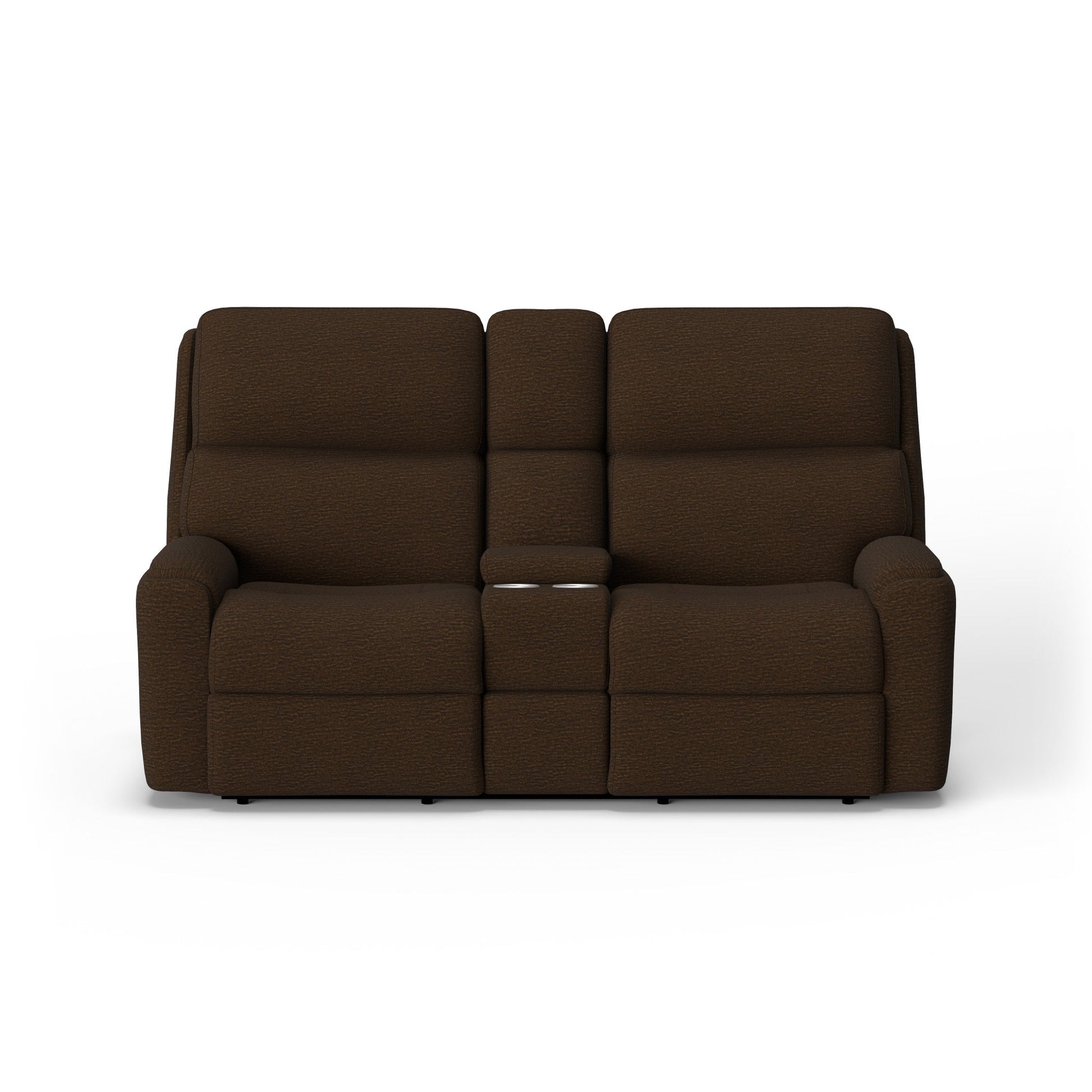 Relax and keep everything you need for streaming or gaming close at hand with the Rio Power Reclining Loveseat with Console. Using the power controls in either of the arms, you and the person you’re sitting with can easily recline. USB charging ports in the controls keep devices powered up and ready when you need them. A center storage console features cup holders and offers plenty of space to organize remotes, magazines and more. Comfort-enhancing design details include plush divided back cushions that cradle your neck, back and lower lumbar. Inset padded armrests take pressure off your forearms, while our patented Flexsteel DualFlex Spring System™ provides firmness and flexibility. Choose from over 250 fabric options—including high-performance fabrics that are cleanable and durable—to create a look that’s all your own.