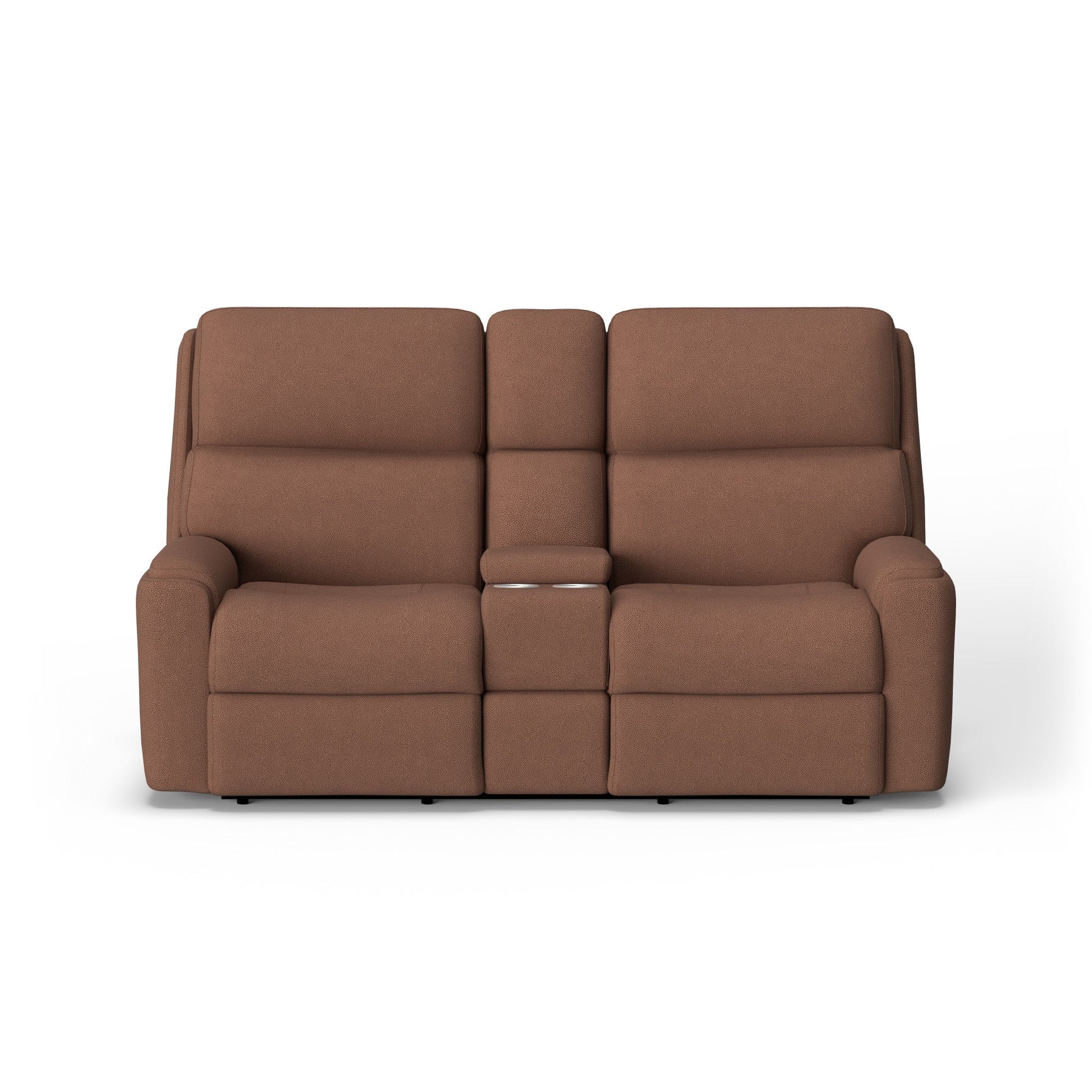 Whether you’re watching movies or playing games, the Rio Power Reclining Loveseat with Console makes it easy to recline and puts items like remotes and beverages close at hand. The spacious center console includes storage for glasses, magazines and other personal items and features two cup holders. Easy-to-access power controls with built-in USB charging ports in both arms allow you to independently adjust the headrest and recline, dialing in the right level of comfort for both people sitting. Designed to enhance your well-being, Rio has divided back cushions that provide comprehensive back support. Inset padded armrests take pressure off your forearms, while our patented Flexsteel DualFlex Spring System™ provides firmness and flexibility. To make this Rio sectional your own, choose from over 250 fabrics options, all in our cleanable, durable high-performance fabric.