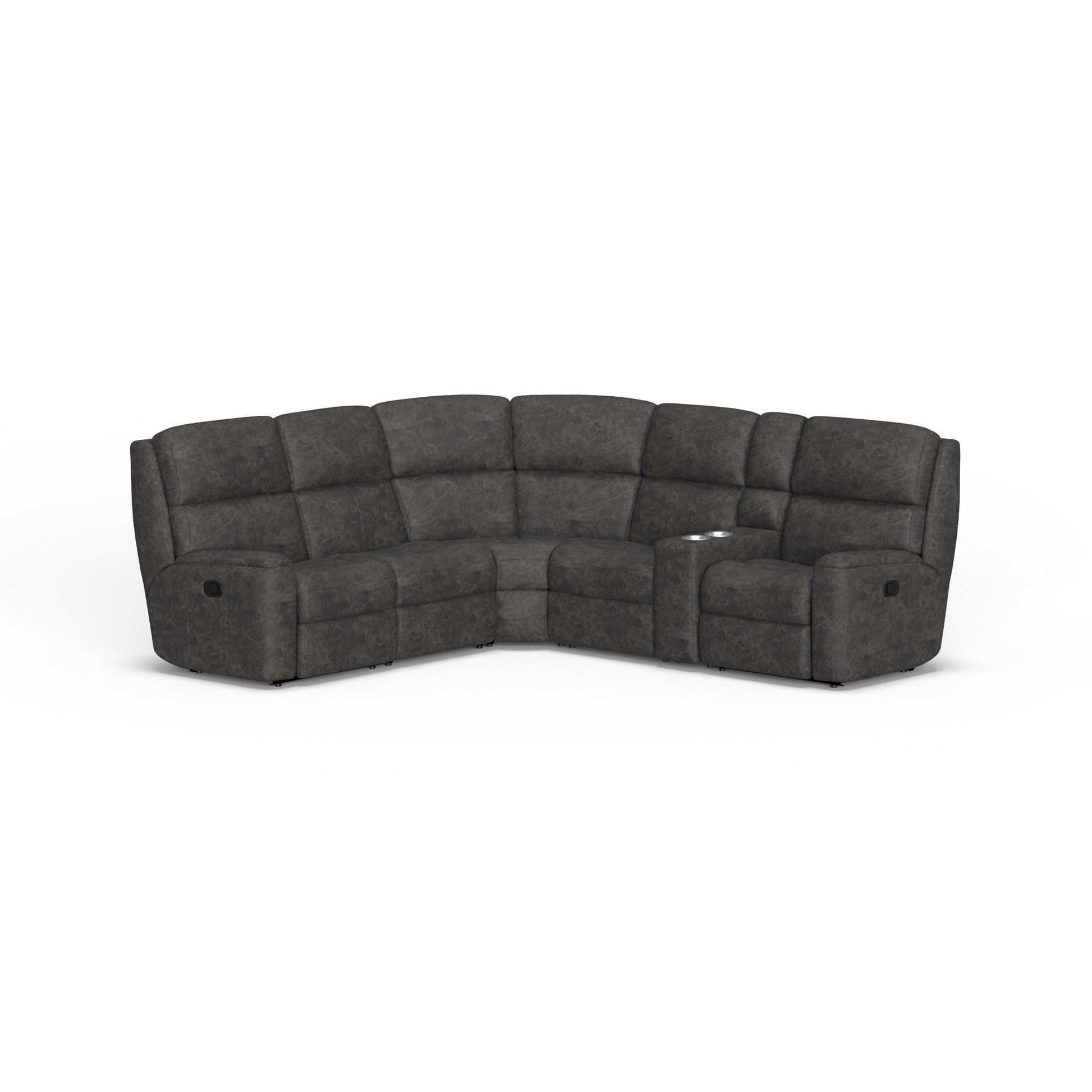 Simply Supportive Relax and enjoy the luxurious feel of the Rio Reclining Sectional, upholstered in premium leather. The entire family will love the divided back cushions which support your neck, back and lower lumbar as you unwind. Adjust the recline with easy-to-access parachute releases in both arms, and keep beverages and remotes close at hand with the convenient storage console. Design details including inset padded armrests have a refined look and provide additional forearm support. You can enjoy this firm yet flexible sitting experience thanks to our patented Flexsteel DualFlex Spring System™, which ensures the sectional will last for years to come. Make Rio your own by choosing from over 50 premium leather options to suit your style. Storage console houses snacks, remotes and other personal items Two drink holders keep beverages close at hand Parachute release on either arm allows sitters to efficiently move between upright and recline positions Divided back cushions cradle your neck, back and lower lumbar for enhanced comfort Streamlined inset padded armrests have a seamless look and comfortable feel Built to last with our patented Flexsteel DualFlex Spring System™—sturdy steel ribbons attached to flexible coils that offer a wide range of motion and durability High-density cushions consist of a high-resiliency, high-density polyurethane foam core with a soft fiber wrap that ensures comfort as you sit and recline Available in over 50 leather options to suit any décor Removable back allows for easy lifting and maneuvering through doorways Footrest easily lowers when you apply pressure in a downward motion Model Number: 3904-SECT Dimensions