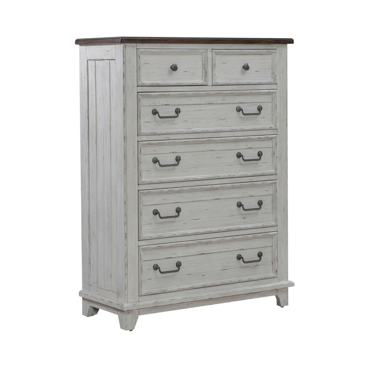 Create a room of your own that provides the perfect start and end to every day with the River place 6 drawer chest. Crafted with excellence using Pine solids and veneers, this chest features a heavily distressed two-tone Riverstone White and Tobacco top finish. The wood framed drawer fronts, along with the framed end panels and top, feature a high-low veneer pattern for textural interest. The drawers feature full extension soft closing drawer guides for an elegant touch, with the top drawers offering premium felt lining and the bottom drawer with a beautiful cedar panel. Wide pilasters flow into angled block feet to complete the farmhouse styling with a timeworn feel that we all know and love. The custom Antique Pewter bail pull and knob hardware accent the River Place 6 drawer chest to help create an inviting, airy atmosphere in your home while providing comfort in your own private getaway.