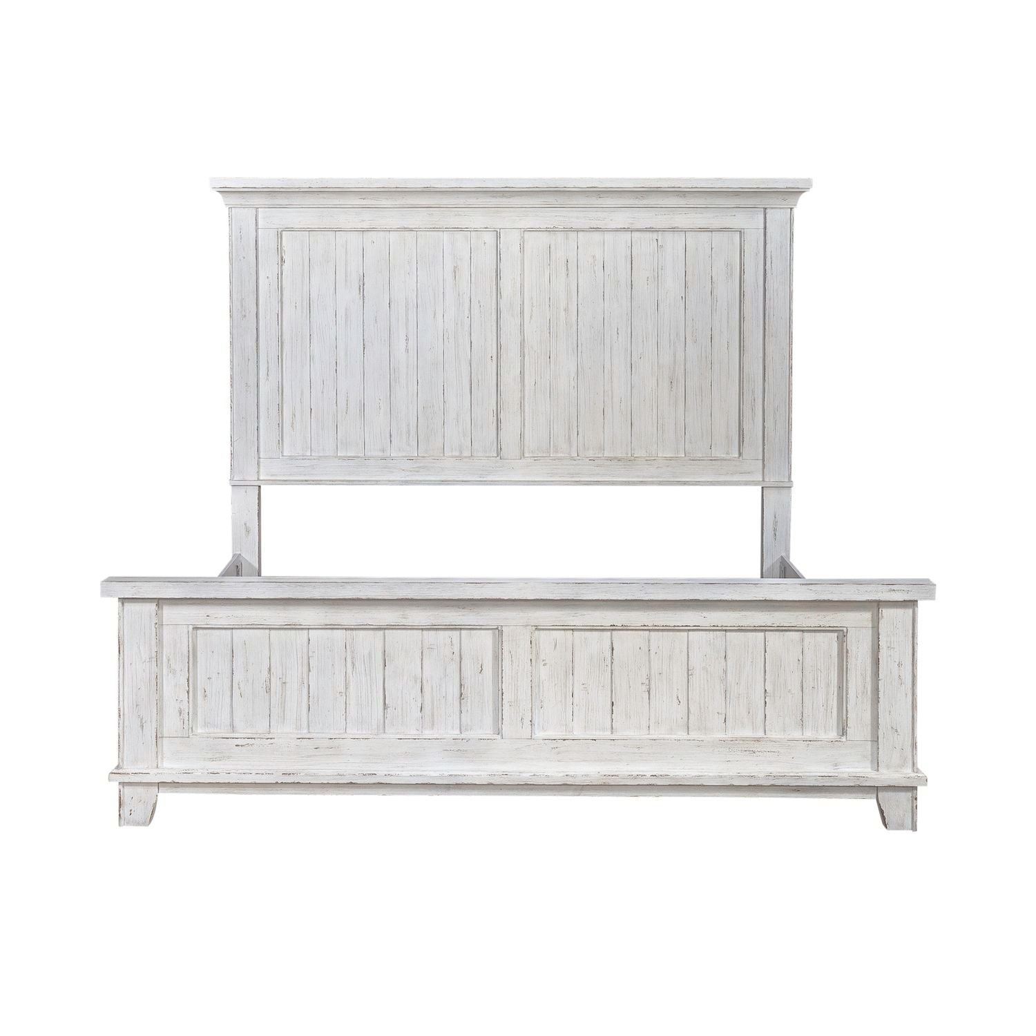 Create a room of your own that provides the perfect start and end to every day with the River Place queen panel bed. Crafted with excellence using Pine solids and veneers, this bed features a heavily distressed Riverstone White finish. Heavy crown molding accents the top of the mansion headboard. A block style cap rail accents the top of the footboard. High-low veneer panels are featured on both the headboard and footboard. Wide pilasters flow into angled block feet to complete the farmhouse styling with a timeworn feel that we all know and love. Use the poster/mansion bed rails, which feature bolt-on support and a center support slat system to complete the bed. The River Place queen panel bed creates an inviting, airy atmosphere in your home while providing comfort in your own private getaway.