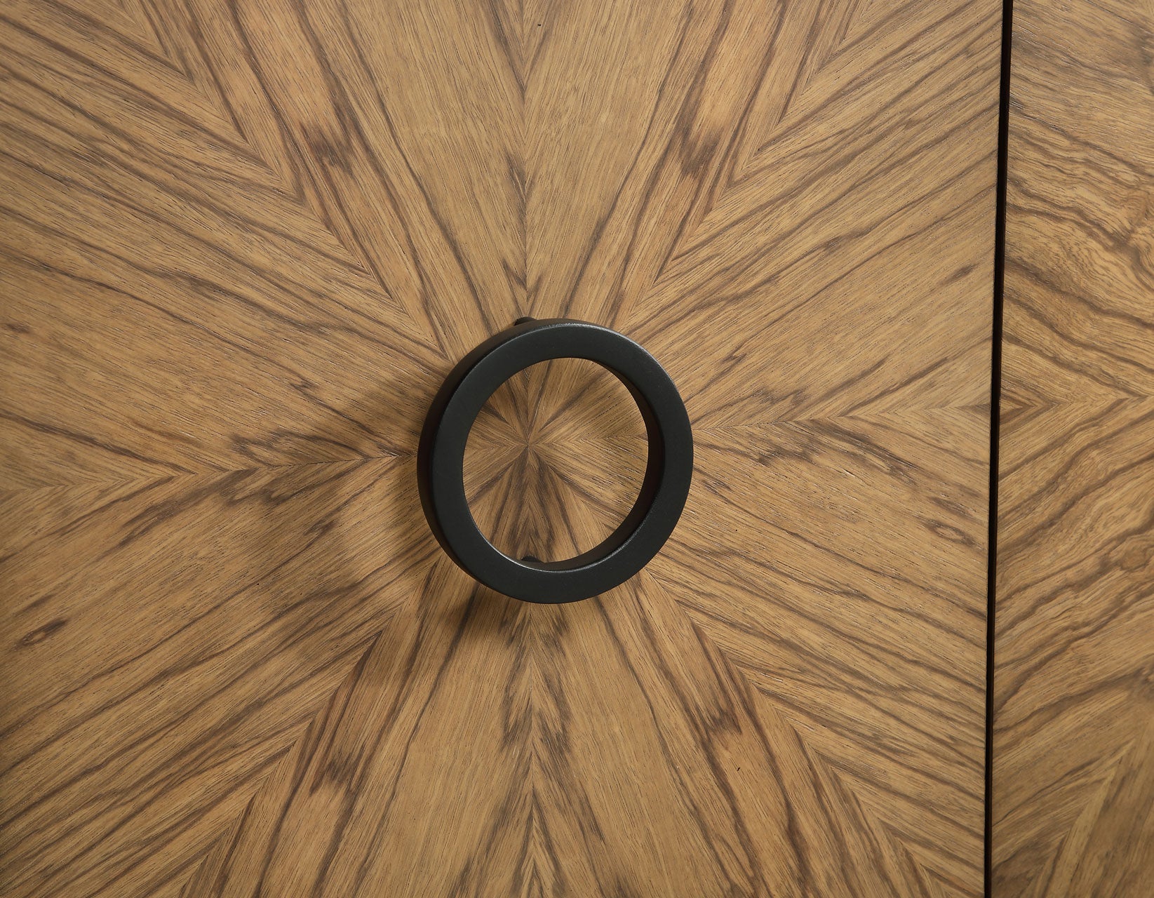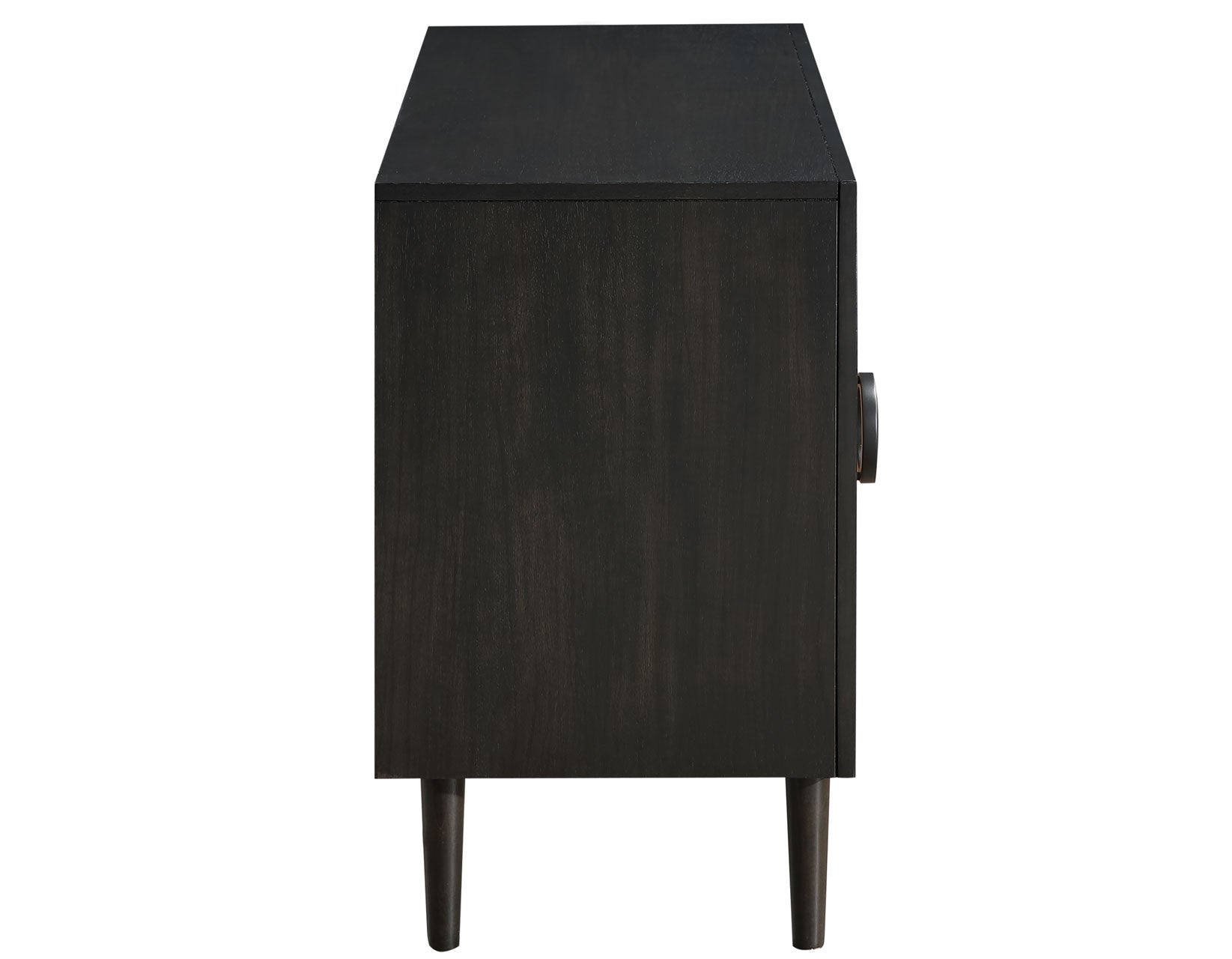 A sleek modern piece, the Roatan Server brings both beauty and functionality to your dining area. Its lustrous black and toffee finish accentuates the gorgeous wood grain of the limba veneers, laid in an eye-catching reverse diamond pattern. The beveled edge and concealed European hinges add to its sophisticated design, making it a standout addition to your home.