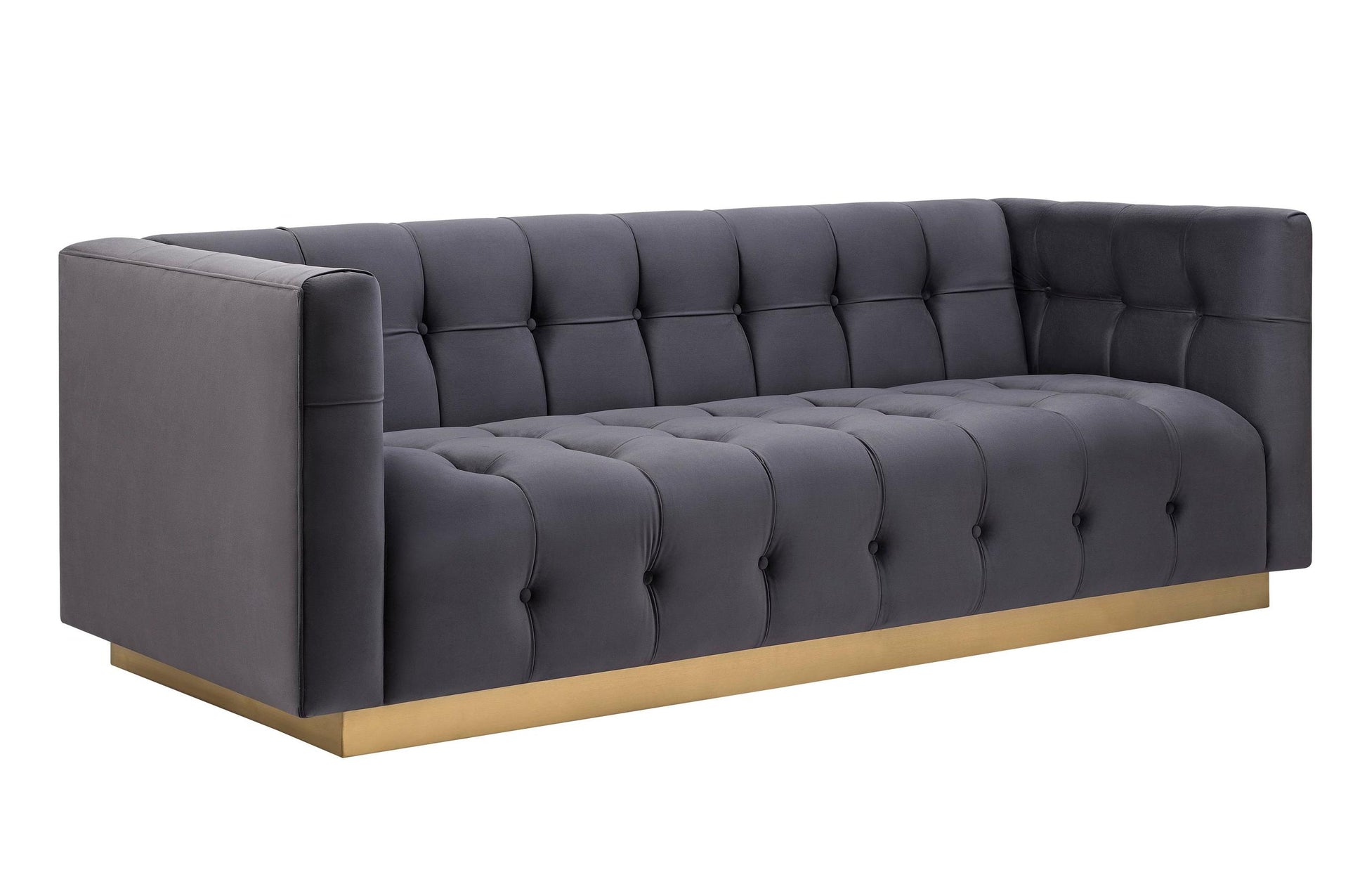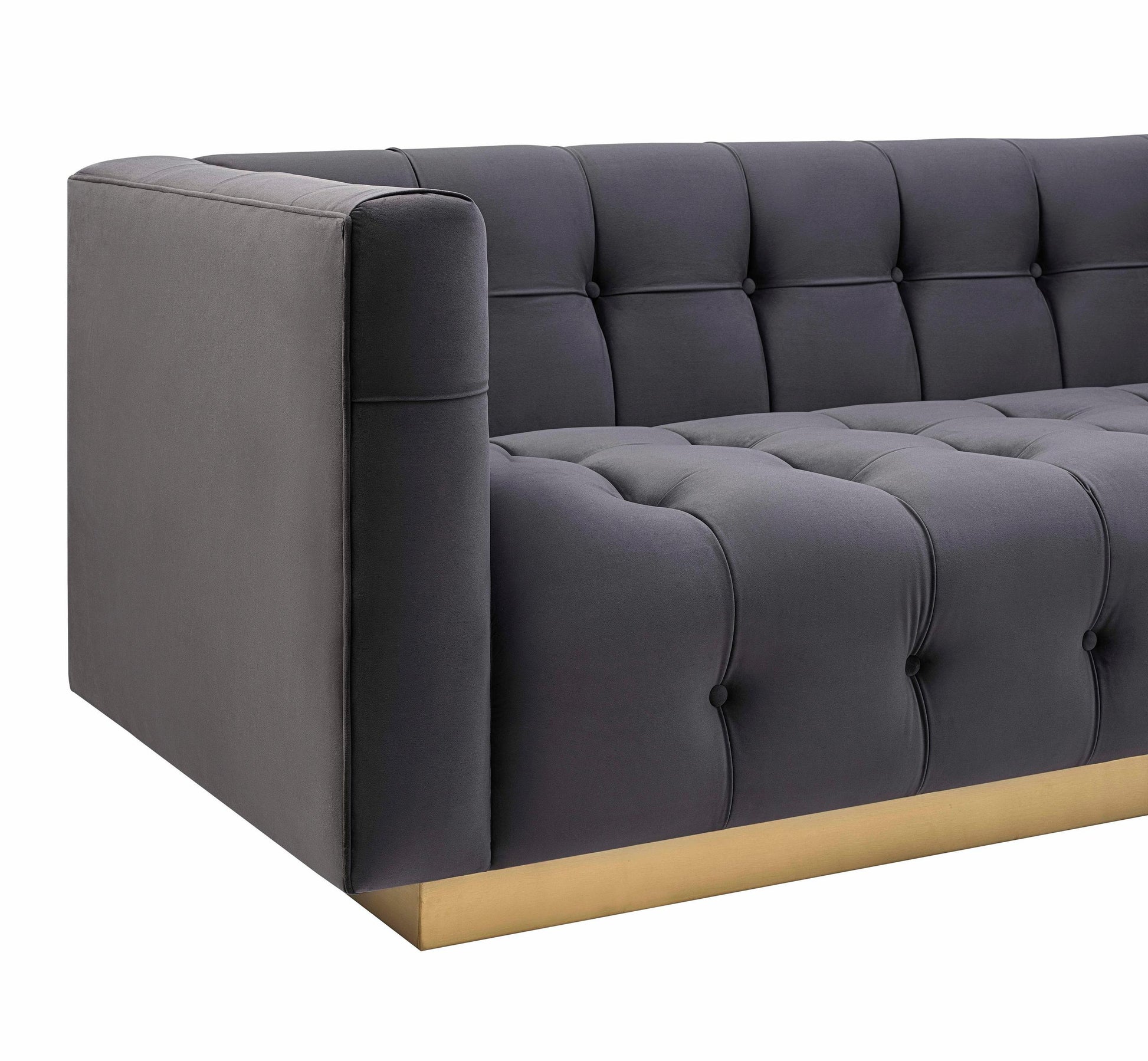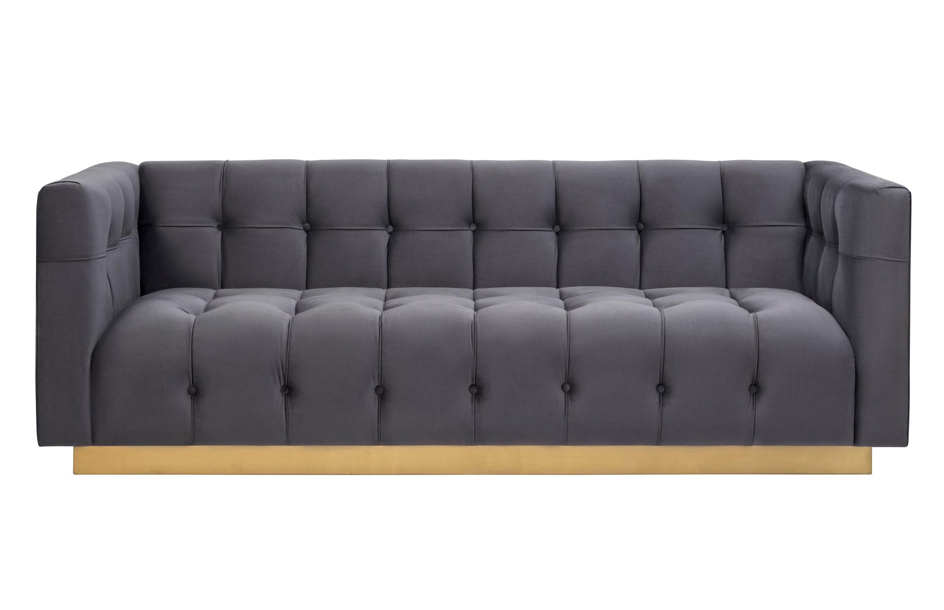 Offering a fresh and modern style this sofa features a glimmering gold base, sumptuous upholstery, and elegant button tufts. Experience luxury with the handmade Roma sofa. Available in multiple, crisp velvet options.