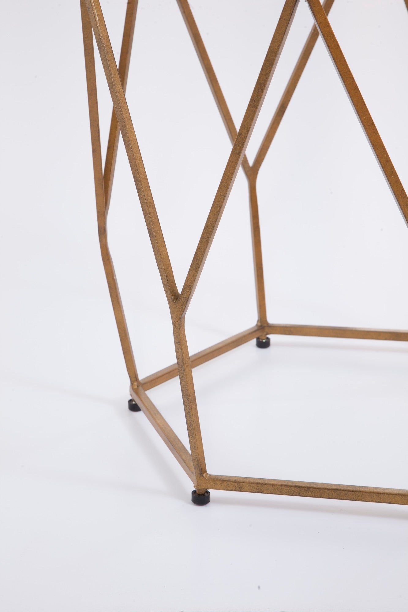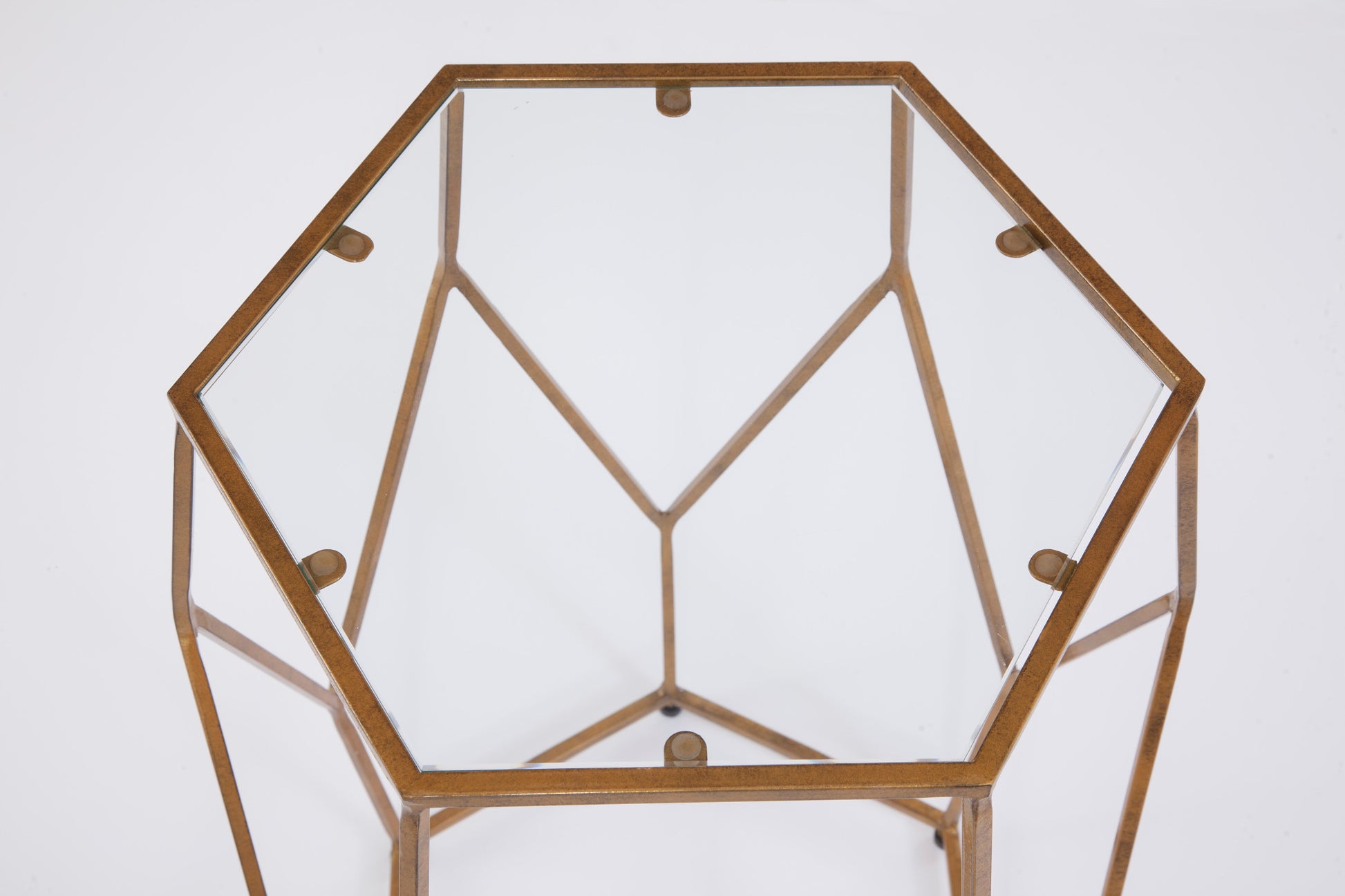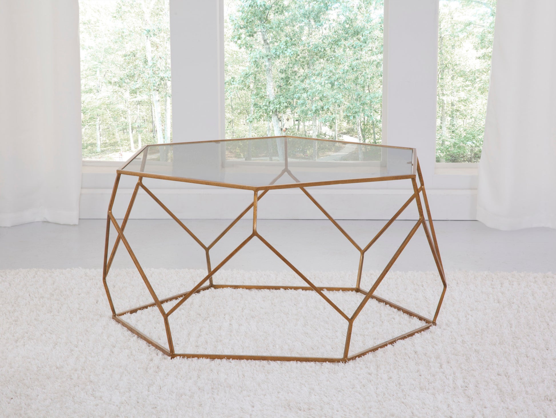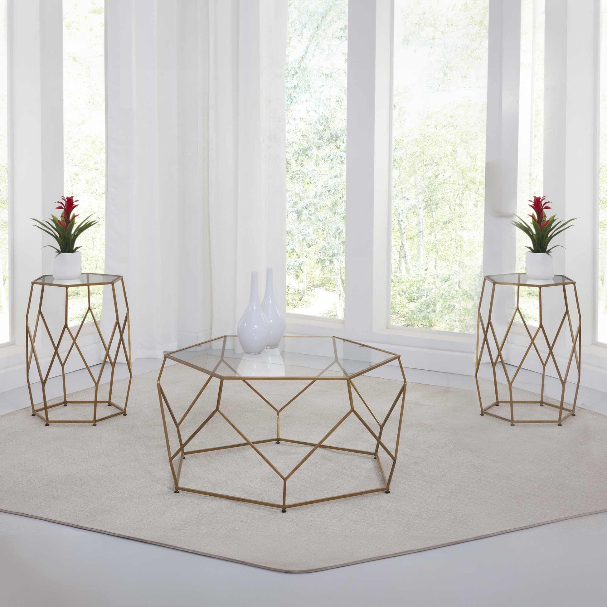 A light and airy table collection with an interesting hexagonal shape, Roxy mixes metal and glass to form a mixed media set that will brighten any living room. The honeycomb metal base adds glamor and style to the set with a standout gold powder-coated base while the clear glass top allows the base its proper display.