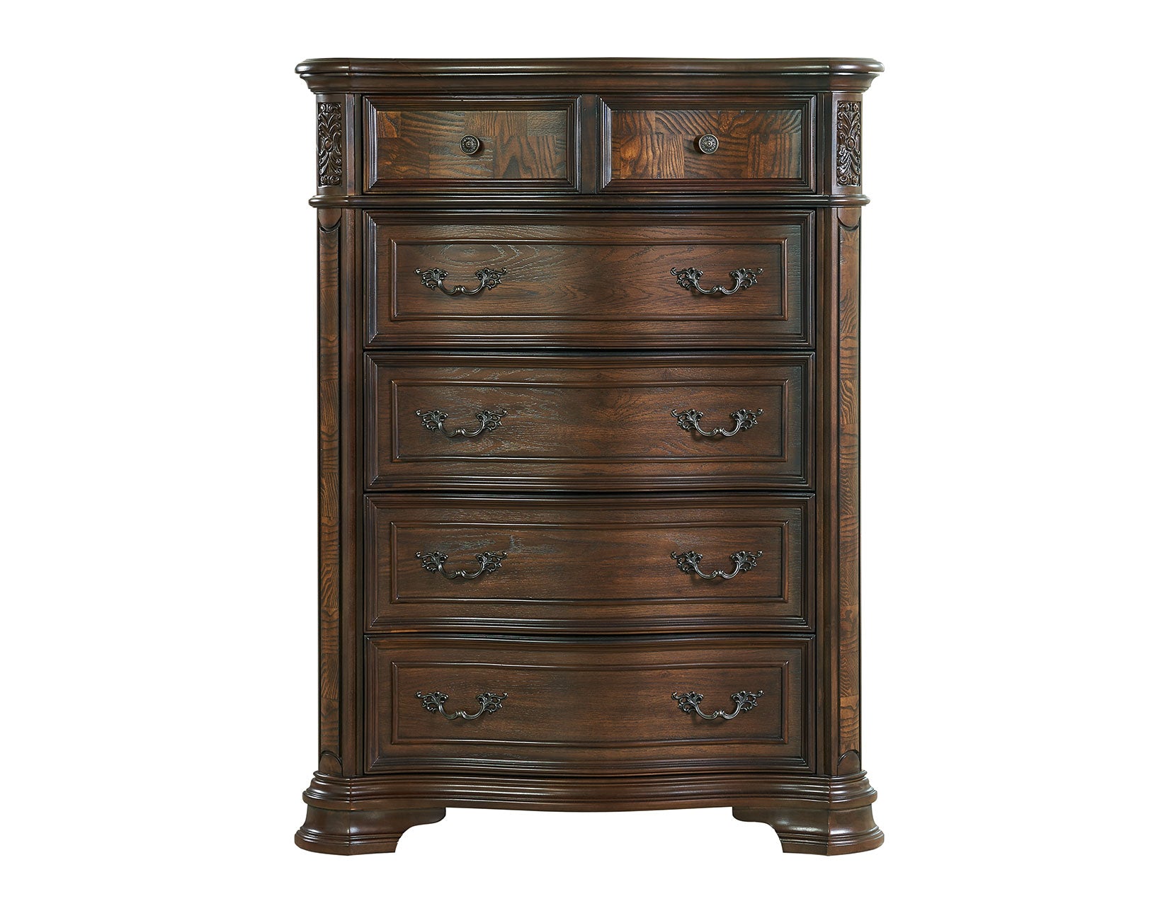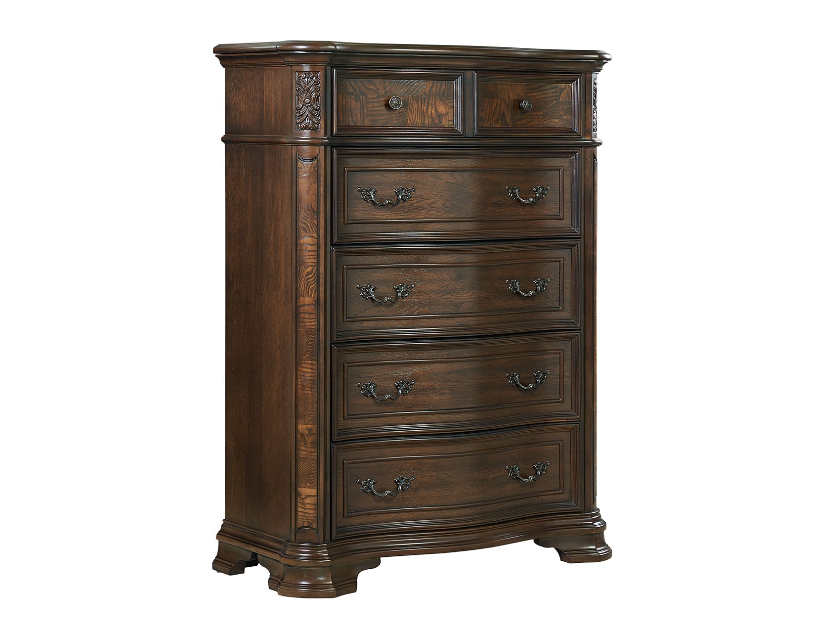 Elegant, traditional styling in a grandly scaled bedroom collection, Royale offers all the essentials of modern life in a package that honors designs from antiques past. Olive ash burl accents combine with a deep, brown cherry finish in a truly opulent presentation. The Lift-Top Chest offers ample storage plus valuable hidden storage at the top.