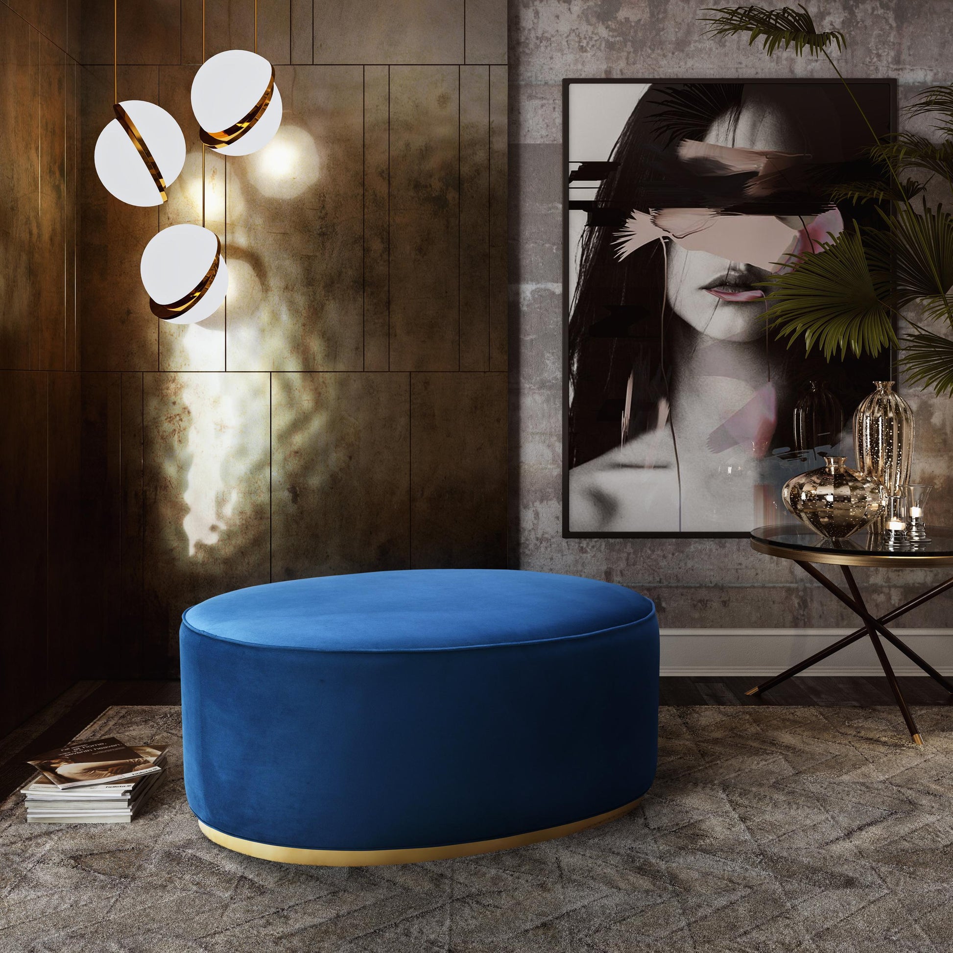 Offering a fresh, contemporary style this large ovaL-Shaped ottoman features a glimmering gold steel base and is enveloped with sumptuous velvet upholstery. This glamourous ottoman pulls double duty as extra seating or as a footrest. Available in your choice of several velvets the Scarlett ottoman provides comfort, durability, and style.