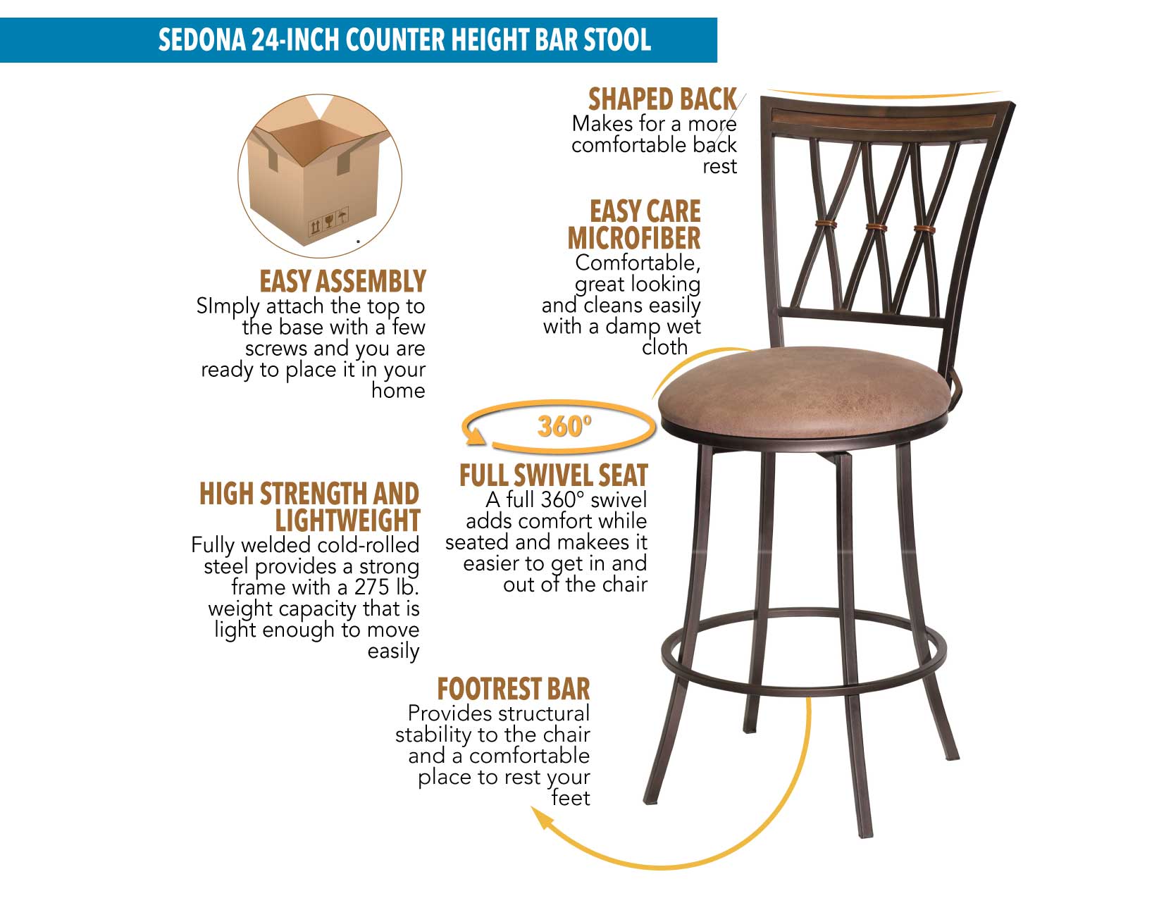 Comfort, style and durability in a Commercial Grade strength Bar Stool, Sedona adds some mixed media style to any counter area. A lustrous brown cherry finish pairs with powder-coated metal finish and brass accents for a sturdy complement to any kitchen. The dark camel leatherette seat is a full 360 degree swivel for maximum comfort. This 30″ seat high chair works with any 42″ counter including Bar counters.