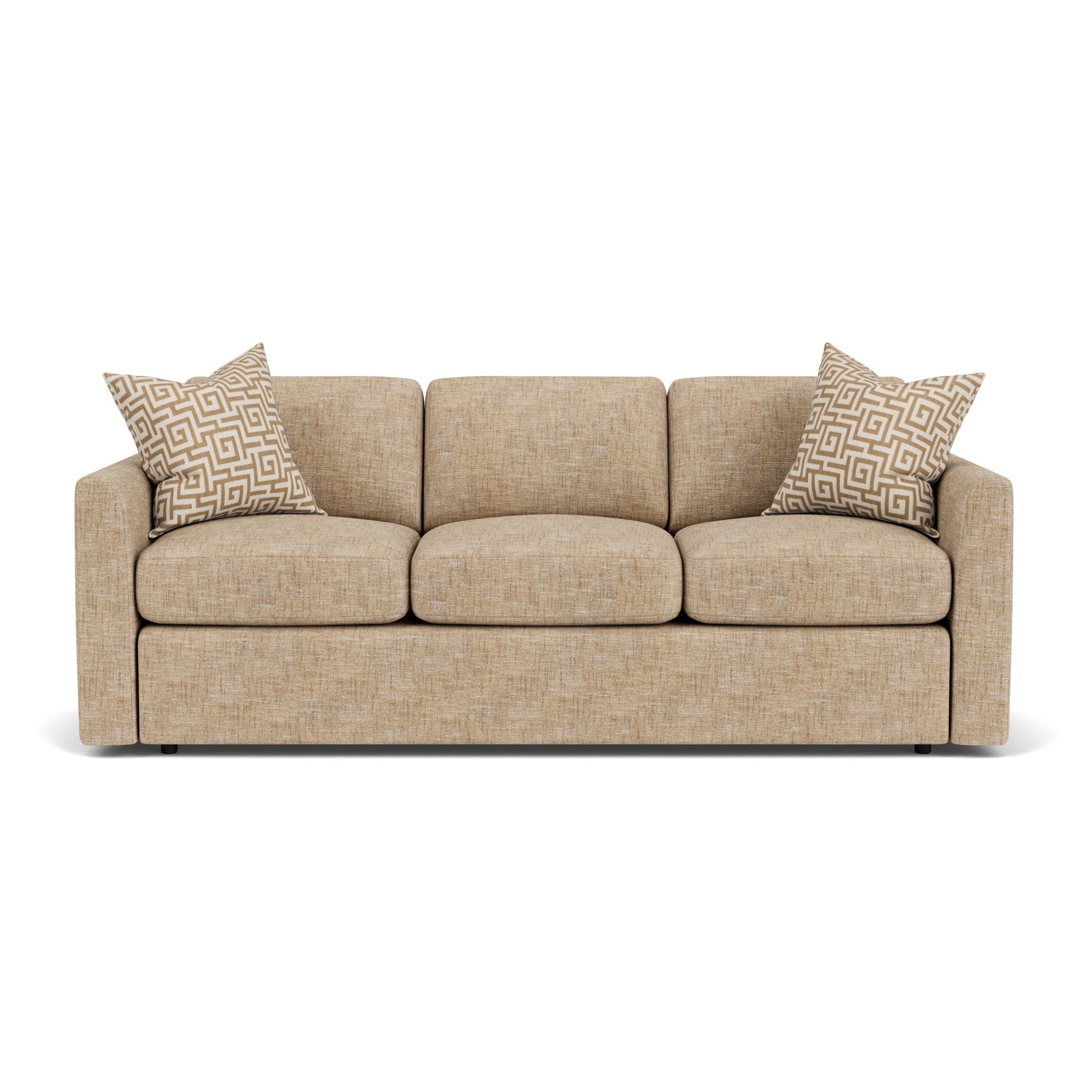 Cradle Yourself In Cloud-Like Comfort You’ll experience the comfort of floating on a cloud as you relax or entertain on the Sky sofa. Featuring recessed legs, a low, deep profile and sophisticated flare arms, the Sky sofa offers a modern look that’s like a breath of fresh air. Surround yourself in lofty, luxurious comfort with removable, reversible seat and back cushions filled with a premium hypoallergenic polyester fill that feels just like down. With hundreds of fabric choices, you can design the Sky sofa to perfectly suit your home. A contemporary silhouette with feminine flare arms and recessed legs Removable back and seat cushions allow you to flip and rotate them for even, lasting wear Includes two accent pillows to enhance your comfort and style Cushions are filled with CloudLux, a hypoallergenic down alternative that provides luxury loft and comfort Built to last with the Flexsteel patented DualFlex Blue Steel Spring that provides an elevated level of support Sustainably sourced wood frame delivers exceptional durability Available in hundreds of fabric choices, including those with robust performance and sustainability characteristics Model Number: 5512-31 Dimensions 34H x 87W x 39L