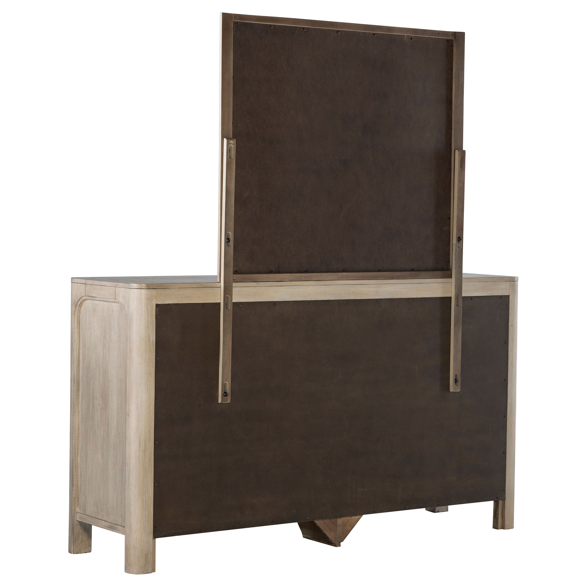 • Nine-drawer dresser with sculpted edges and matching mirror for elegant bedroom storage