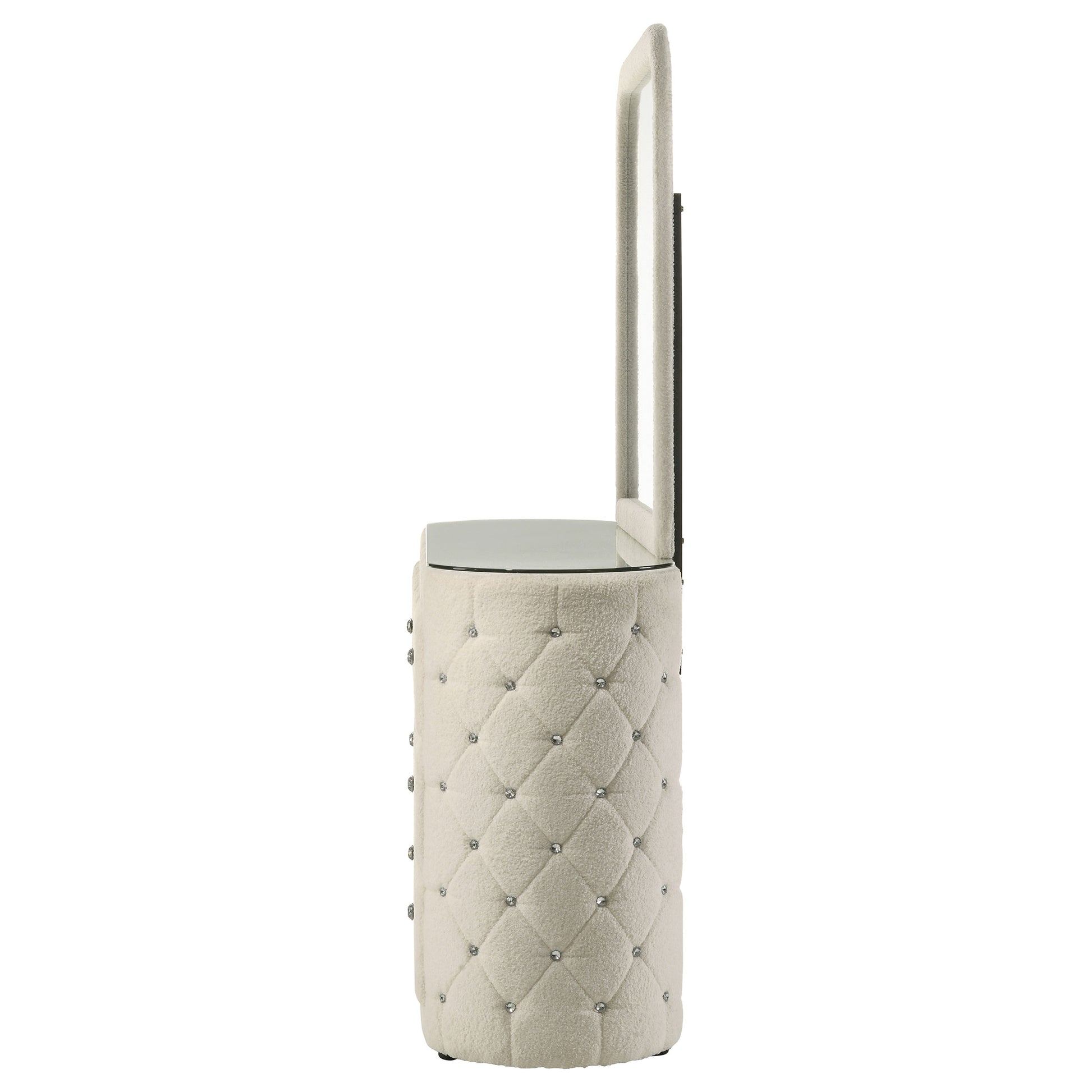 • Dresser and mirror set features plush boucle upholstery in a soft ivory tone throughout