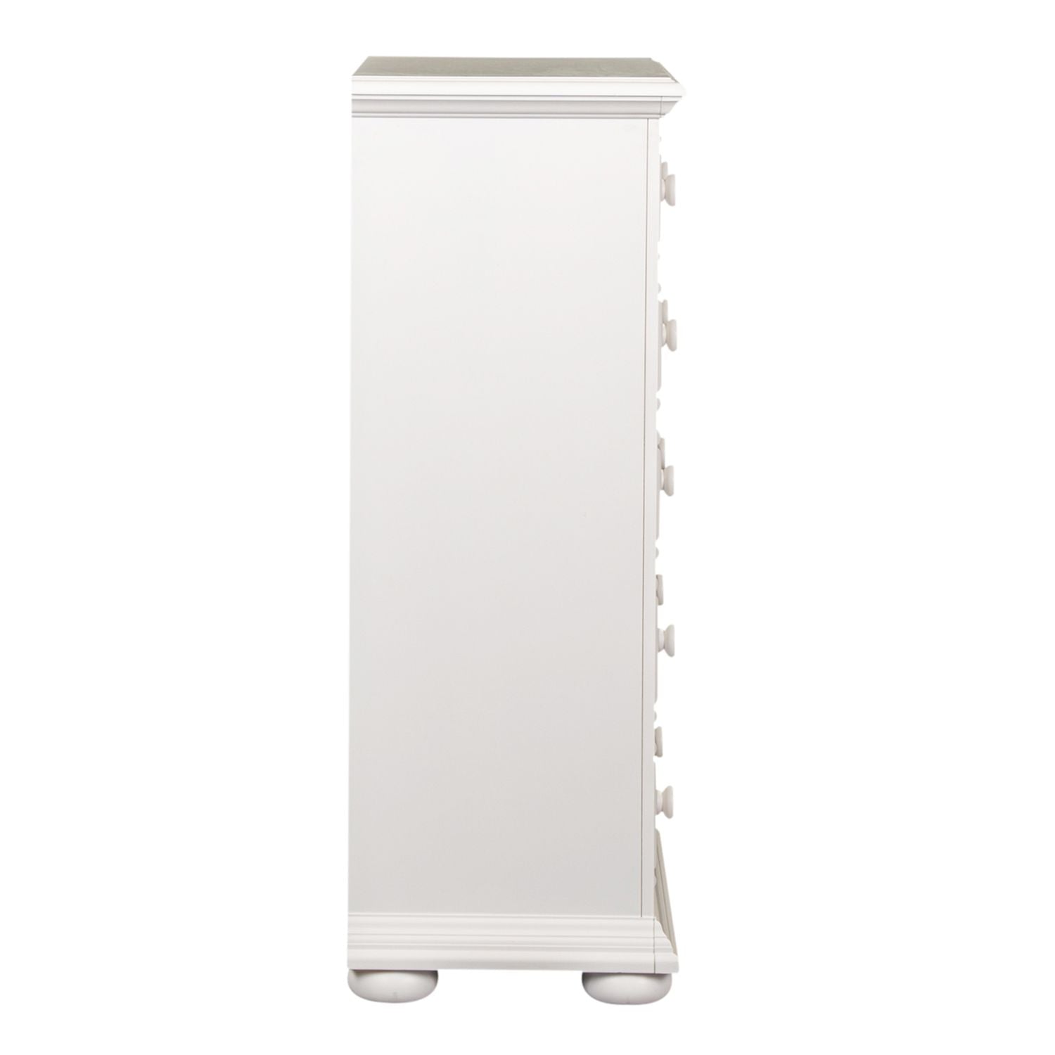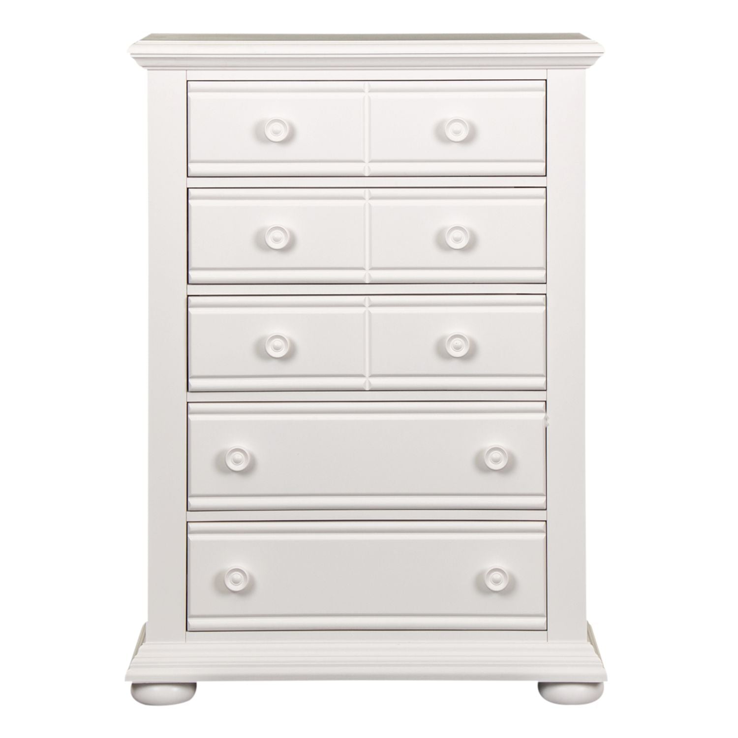 Obtain a fashionable cottage look with the Summer House 5 drawer chest. Crafted of pine solids with painted MDF, this piece features the best of cottage in an oyster white finish, bottom case dust proofing, fully stained interior drawers, full extension drawer glides for easy access to storage, bluff cut top drawers, bun feet, felt lined top drawers, and is accented by wood knob hardware.