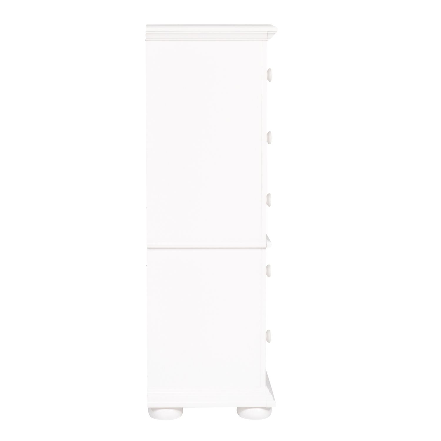 Obtain a fashionable cottage look with the summer house chest. Crafted with poplar and pine solids with wood products, this piece features 5 drawers, bottom case dust proofing, felt lined top drawers, and fully stained interior drawers. The oyster white finish is accented by wooden knob hardware.