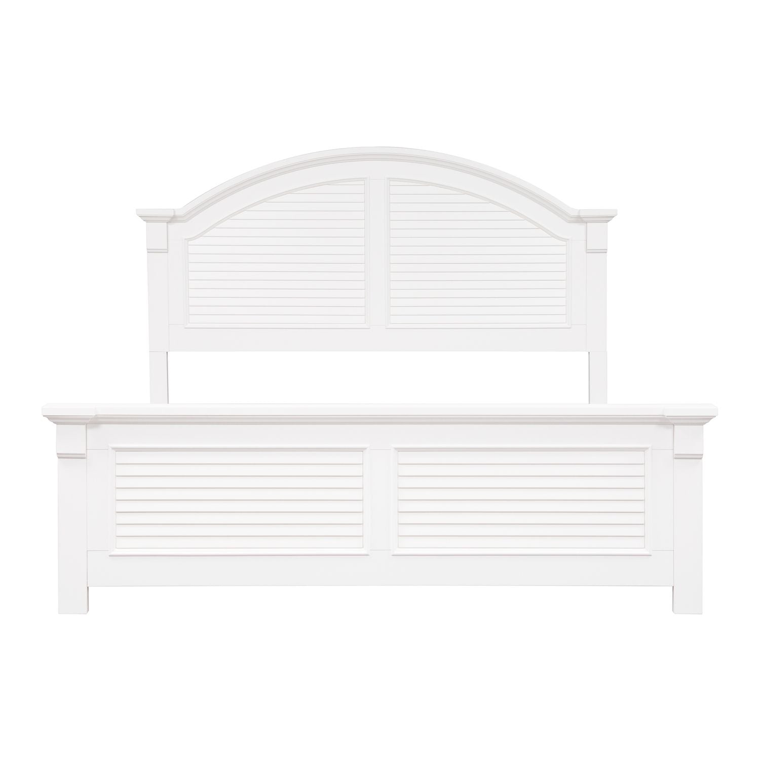 Live life beautifully with the Summer House I queen panel bed, dresser, mirror, and chest. Crafted of poplar and pine solids this kit features an oyster white finish, bead molding, bun feet, full extension drawers with felt lined top drawers, and is accented with wooden knob hardware. The panel bed features louvered panels and arched crown molding. The dresser has two louvered panel doors and five drawers including two smaller flip down top drawers. Attach the arched louvered panel mirror with a beveled edge with the included bolt-on supports. The chest offers an additional five drawers of storage, with the top three drawers having bluff-cut drawer fronts to give the illusion of smaller drawers, while still offering deep storage. With cottage design always in fashion, make the Summer House I a staple in your home.