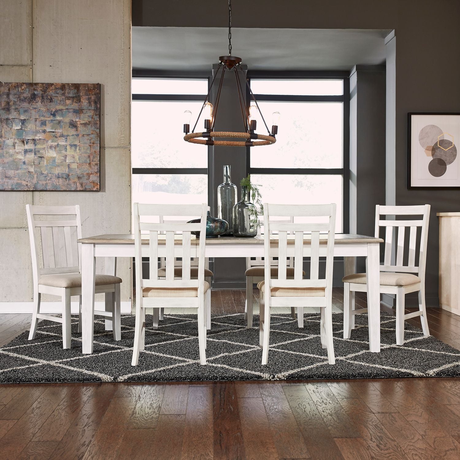 Sitting pretty with the Summerville seven-piece rectangular table set. Crafted of rubberwood solids with pine veneers, this set features soft whitewash bases with a wire brushed gray top and consists of the leg table and six splat back side chairs. The table includes an 18” removable leaf to accommodate guests or a larger family. The chairs have a padded upholstered seat in cream linen and feature tapered legs with nylon chair glides to protect your flooring. Summerville features the best of cottage design with a casual two-tone finish that works well with any interior.
