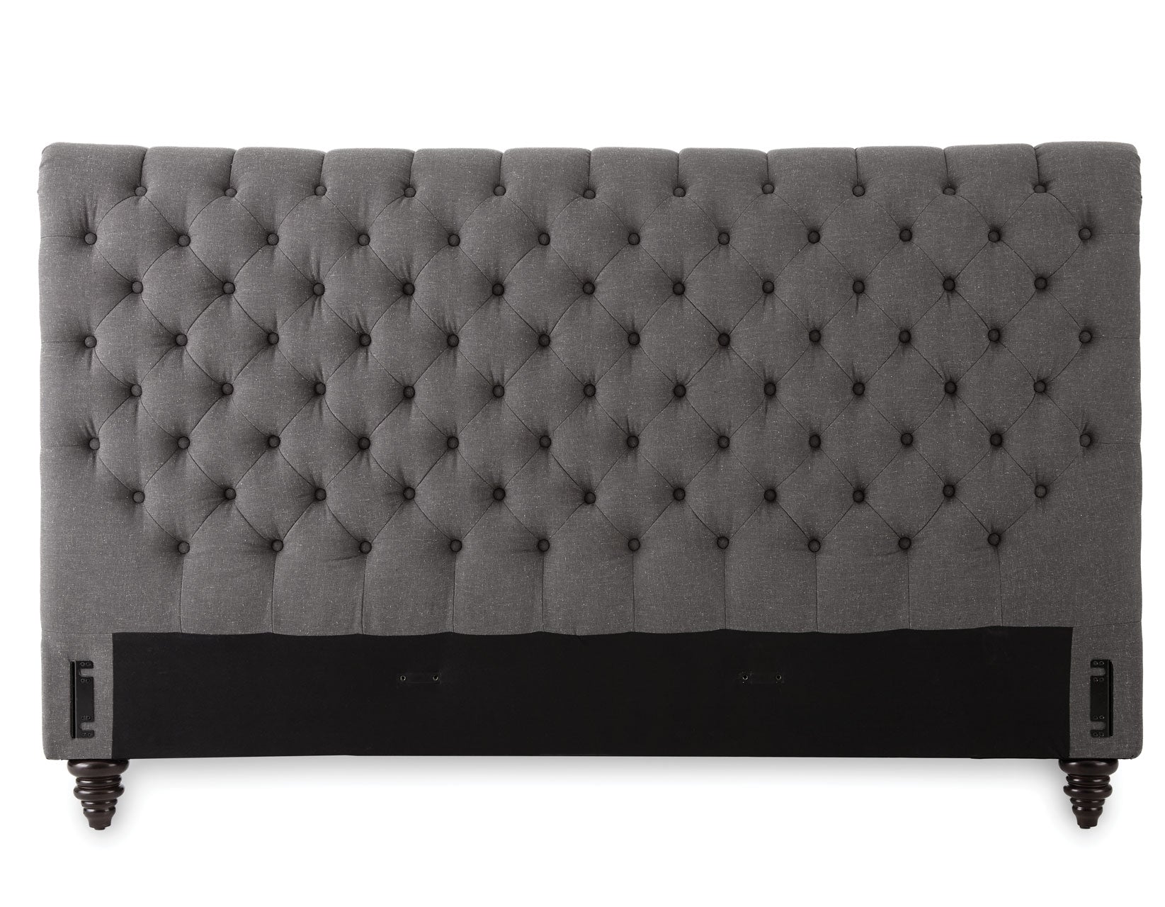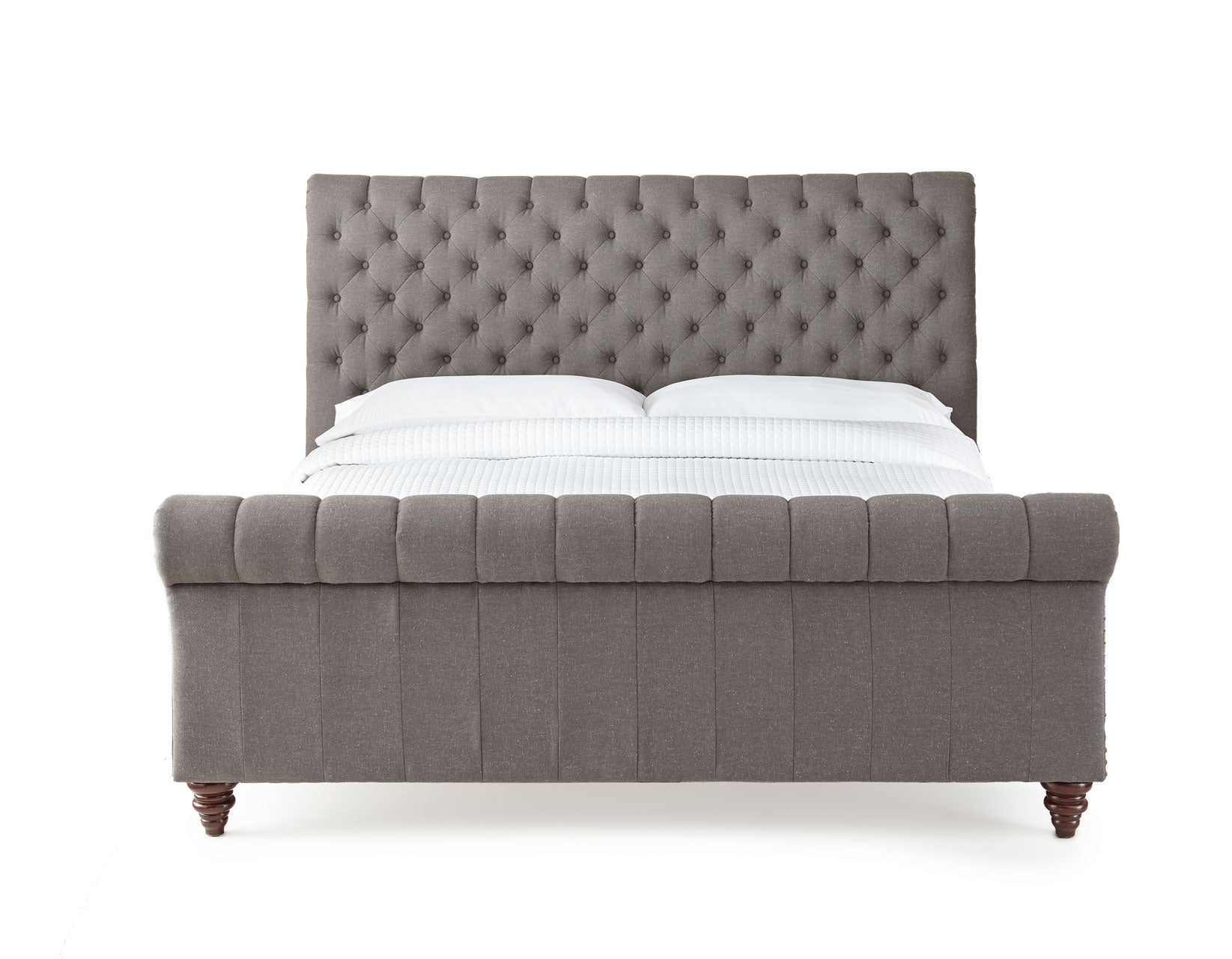Relax in comfort with the Swanson upholstered bed from Steve Silver Company. A tufted headboard and nailhead trim are just some of the details built into this bed. The rolled headboard and footboard make the bed and stylish statement and the 39 piece rail system ensures a sturdy foundation for your good night’s sleep. Available in king or queen bed, the bed is shown in Gray and is also available in Sand color.