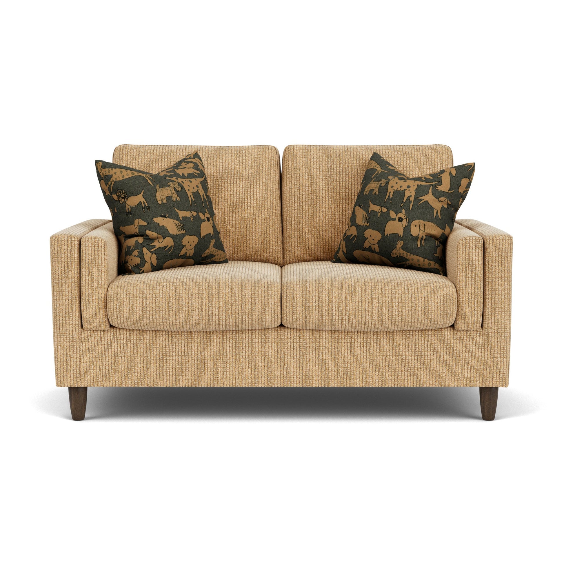 Retro Revival Experience timeless appeal with a modern twist with the Thomas loveseat. Inspired by classic mid-century style and vintage Flexsteel designs, this loveseat features layered arms, round tapered legs and bullnose cushions. Create the perfect style for your home with your choice of upholstery and pillow fabrics. Sized for ultimate versatility, the Thomas loveseat brings casual sophistication and unmatched comfort to any living space. Attached layered arms remain in place over time Round tapered legs in your choice of three finishes Includes two accent pillows in your choice of fabric to match your personal style The patented Blue Steel Spring in the seat provides unmatched support and lasting comfort Sustainably sourced wood frame delivers exceptional durability The removable and reversible back and seat cushions allow you to flip and rotate them for even wear The seat cushions have a high-resiliency foam core that is engineered to maintain its shape over time and contain a layer of recovery foam and a soft fiber top for luxurious comfort Upholstered in your choice of fabric, including those with performance and sustainability characteristics Handcrafted in North America Model Number: 5350-20 Dimensions 36H x 61W x 36L