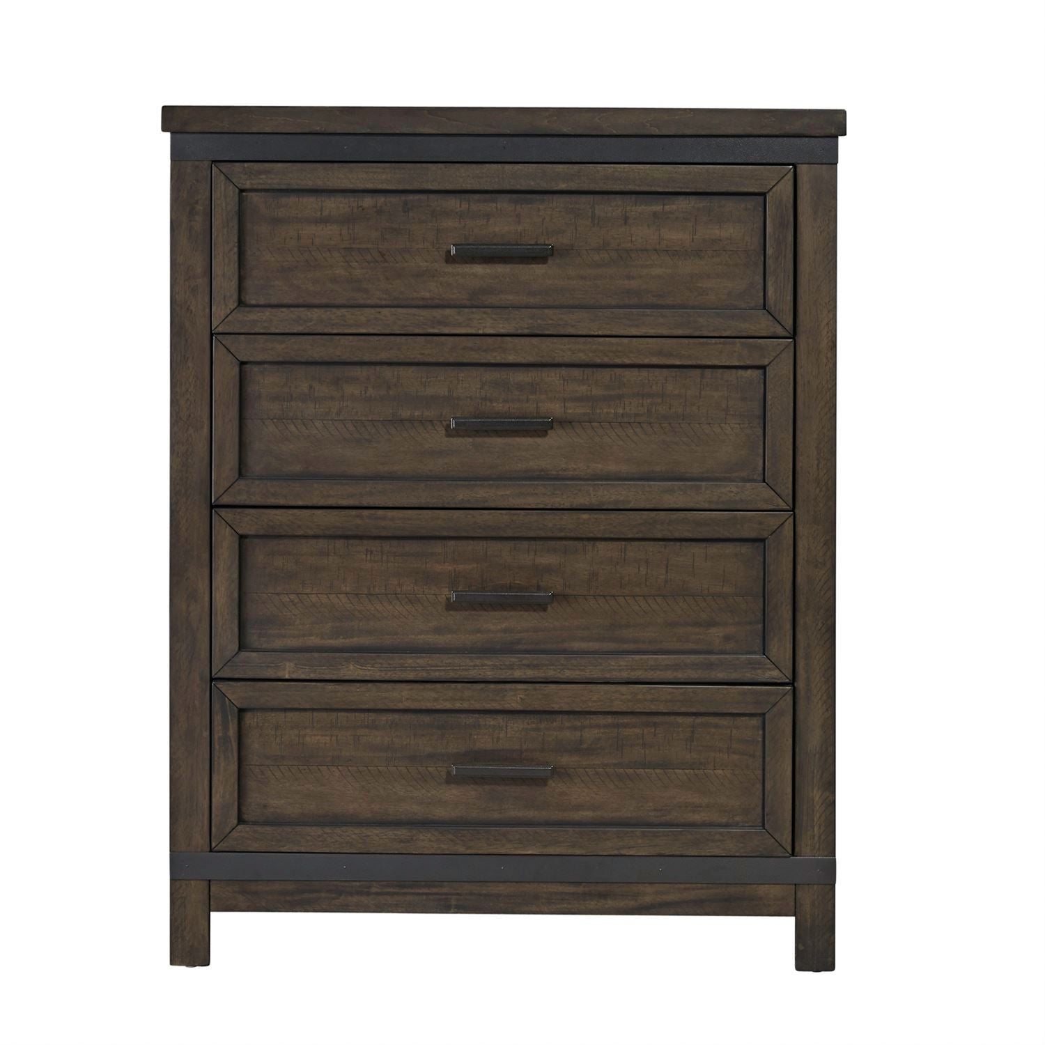 Add a natural feeling to your living space using the Thornwood Hills 4 drawer chest. Crafted by rubberwood solids and mango veneers, this piece features a rock beaten gray finish with saw cuts, wide pilasters with block feet, planked top and sides, fully stained interior drawers, felt lined top drawer, full extension drawer glides for easy access to storage, hammered metal bar pull hardware in a dark antique pewter, framed drawer fronts, bottom case dust proofing to protect contents, hand hammered metal strip accents, and heavy distressing.