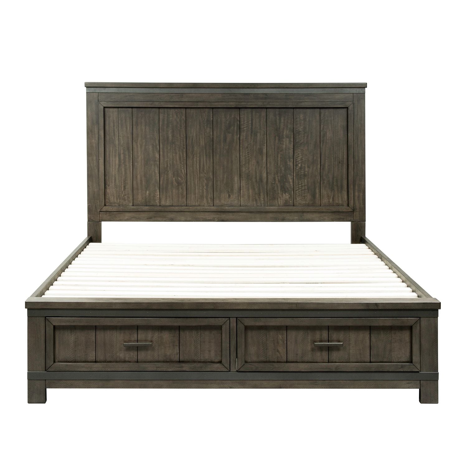 Enhance your home with the Thornwood Hills king two-sided storage bed, dresser, mirror, chest, and nightstand. Crafted of rubberwood solids with mango veneers, this kit features a rock beaten grey finish with saw cuts, straight line cases with wide pilasters and block feet, metal strip accents, planked tops and side panels, wood framed drawer fronts, full extension drawers with felt lined top drawers, and is accented with dark antique pewter hammered metal bar pull hardware. This functional two-sided storage bed features two drawers in the footboard, and a drawer on each side rail maximizing storage space beneath your bed. The dresser features eight drawers of storage, and pairs well with the wood framed mirror that features a beveled edge. Attach the mirror to the dresser with the included bolt-on supports. The chest offers you an additional five drawers of storage. Place the two drawer nightstand next to your bed to complete this look. Add this unique bedroom set to your traditional style home.