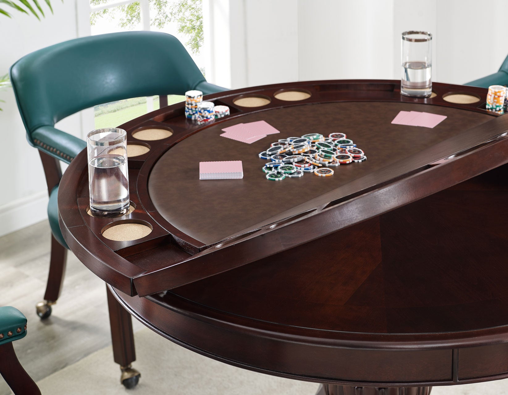Enjoy both game night and dining nights with this dual-purpose dining and game table. The 48-inch round table comes in a medium cherry finish and can accommodate four comfortably for dining. The table easily converts to a game table with the addition of the game table-top that is available in brown faux-leather (as shown) or black faux-leather. The game top folds and stores easily and the table goes back to a dining table. The upholstered.faux-leather captain’s chair is castered for easy mobility and comes in a wide range of colors perfect for every decor.