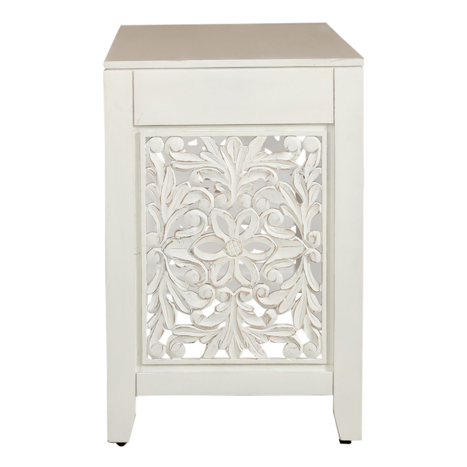 The Boho inspired Trellis Lane accent desk will make your room both functional and stylish. Crafted of solid mango in a weathered white finish with brown rub thru. Features artisan hand craved side panels, one wood trim drawer and wood knob hardware. The perfect size for small places from your living room to a bedroom. Add the accent chair and bookcase to complete your look.